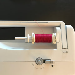 The first thing to do is wind thread onto a bobbin. This is called “filling the bobbin.” It’s best to do this first because threading the bobbin uses some of the same guides as threading and if your machine is threaded, it’ll just get in the way.