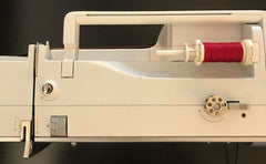 Start by putting a spool of thread on the spool pin and cap it with the spool holder, if needed. The thread should wind off the spool towards the back of the machine, (just like when filling the bobbin). Bring the thread to and around the upper thread guide.