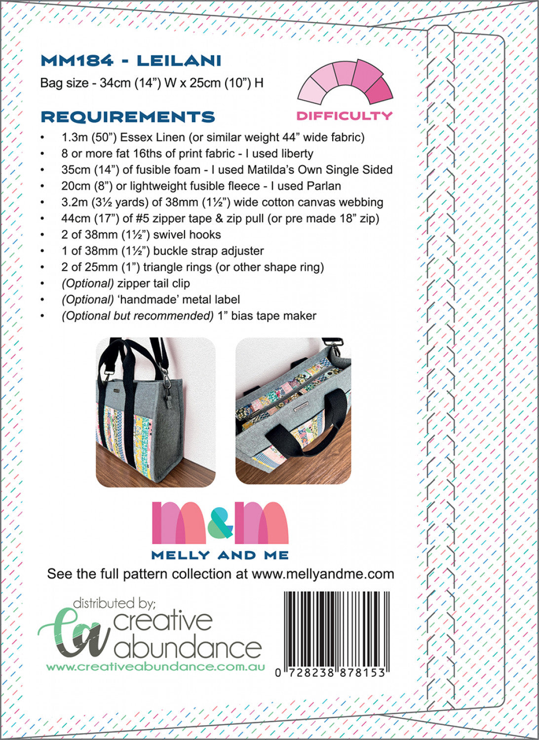 The Leilani tote is completely practical while also being super stylish. This medium-sized tote is easy to carry while having ample space for everything you could need. Featuring tote handles as well as a removable and adjustable shoulder strap, this bag is ready for any occasion. The external/internal pockets and top zipper panel are a great way to use up those favourite scraps, fat 16ths, or even layer cakes! This Pattern contains full photographic step-by-step instructions and full-sized templates