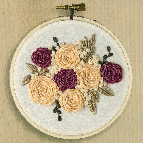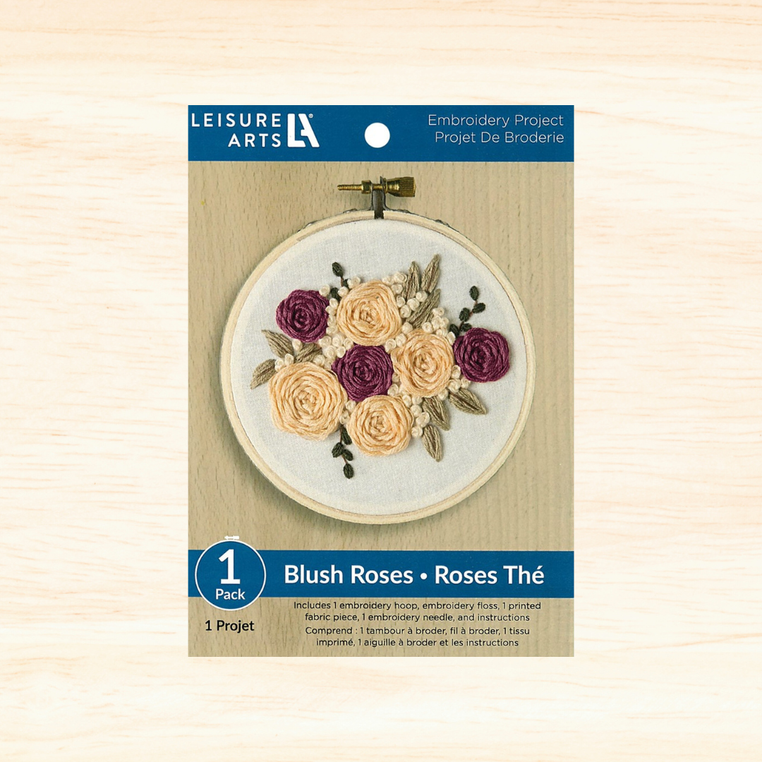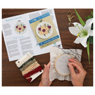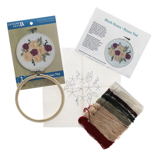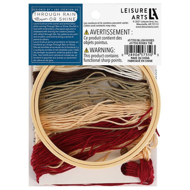 Kit includes: 1 wooden 4" embroidery hoop, 6 embroidery floss colors, 1 printed 7"x 7" fabric piece, 1 needle, and instructions in both English and French.