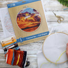 Counted cross stitch design features a sunset with transitions from blue to purple then a bright beautiful orange.