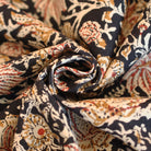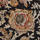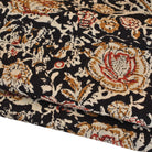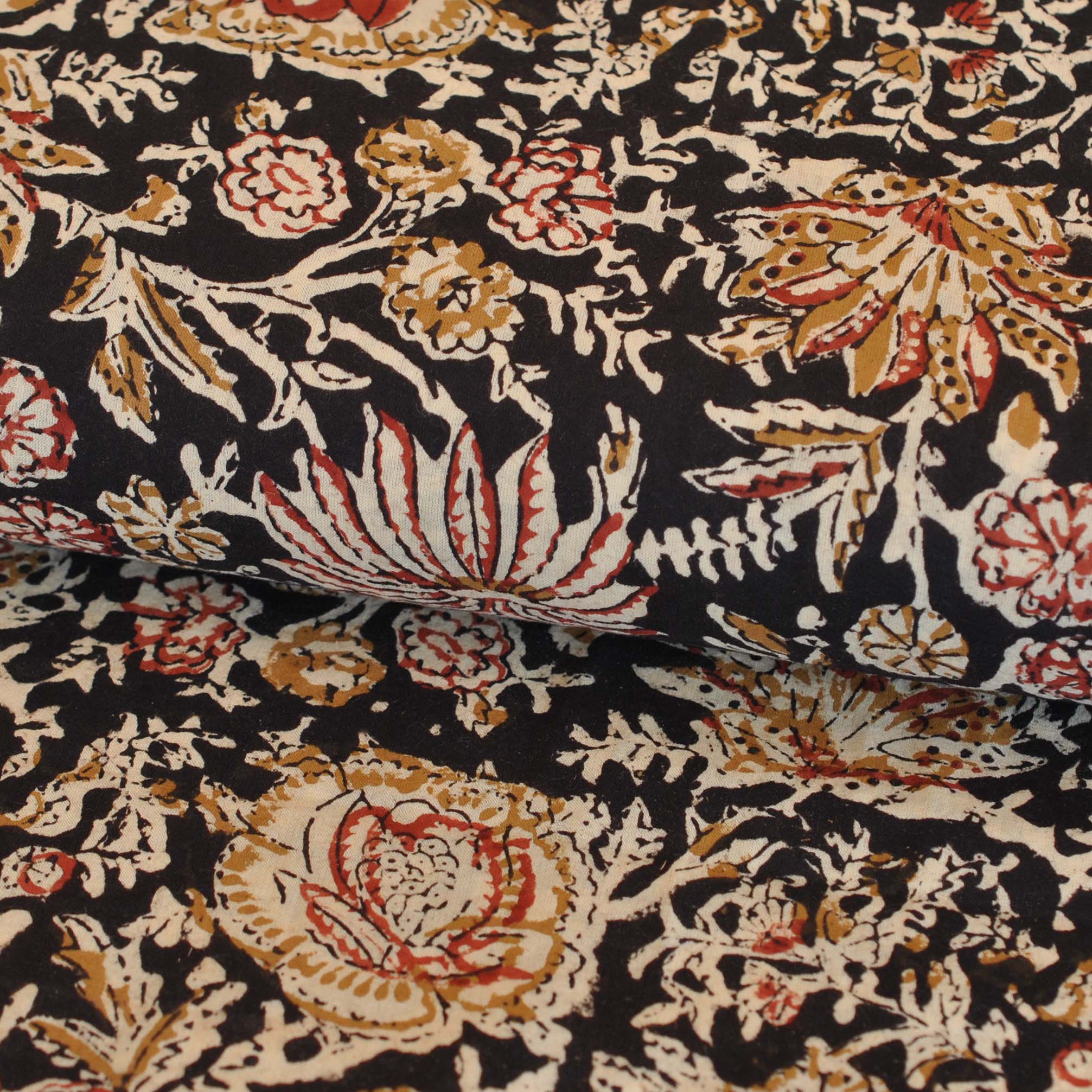 A unique floral hand block print in tan and red on a dark brown background. Made using traditional hand block and dye techniques from Jaipur, Rajasthan.