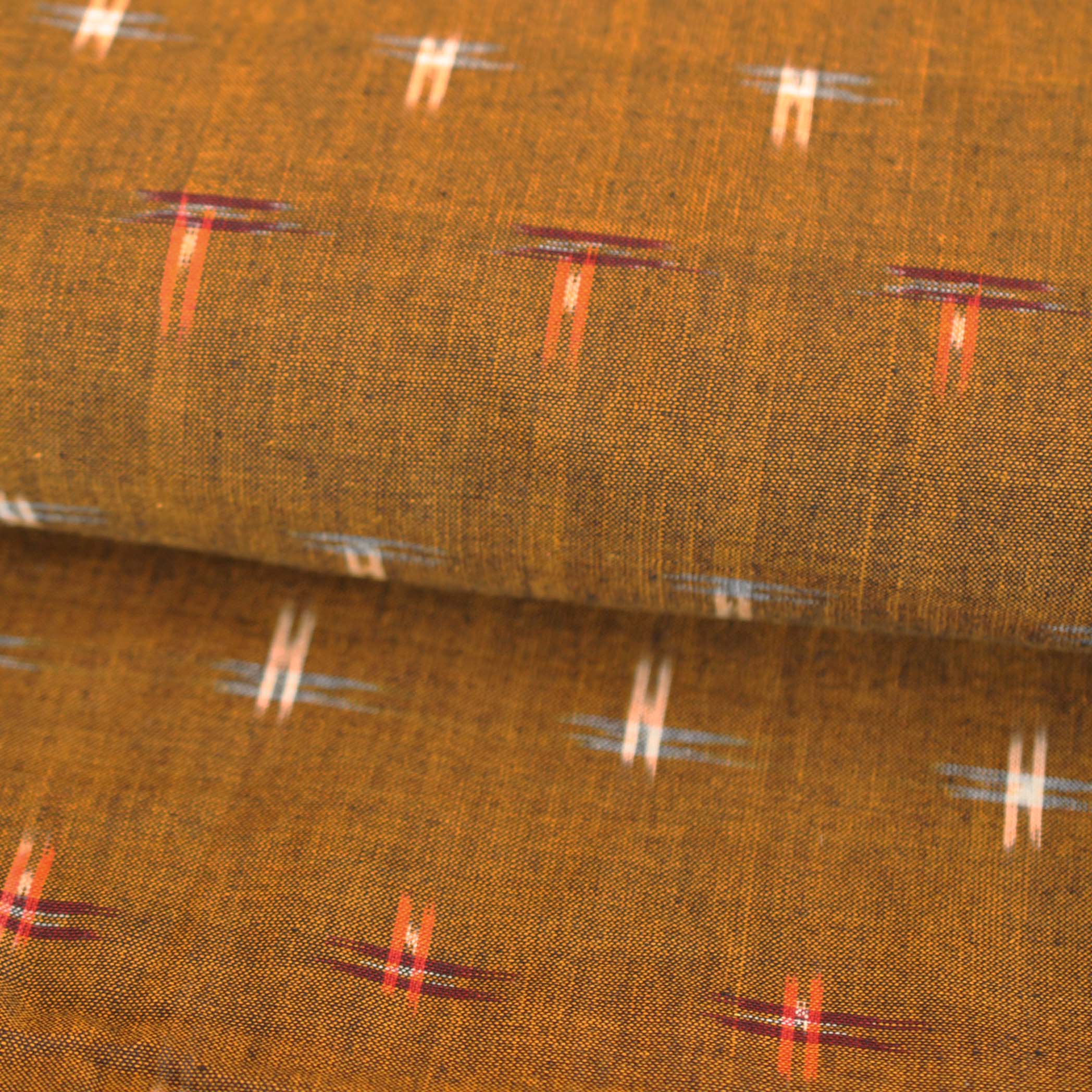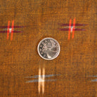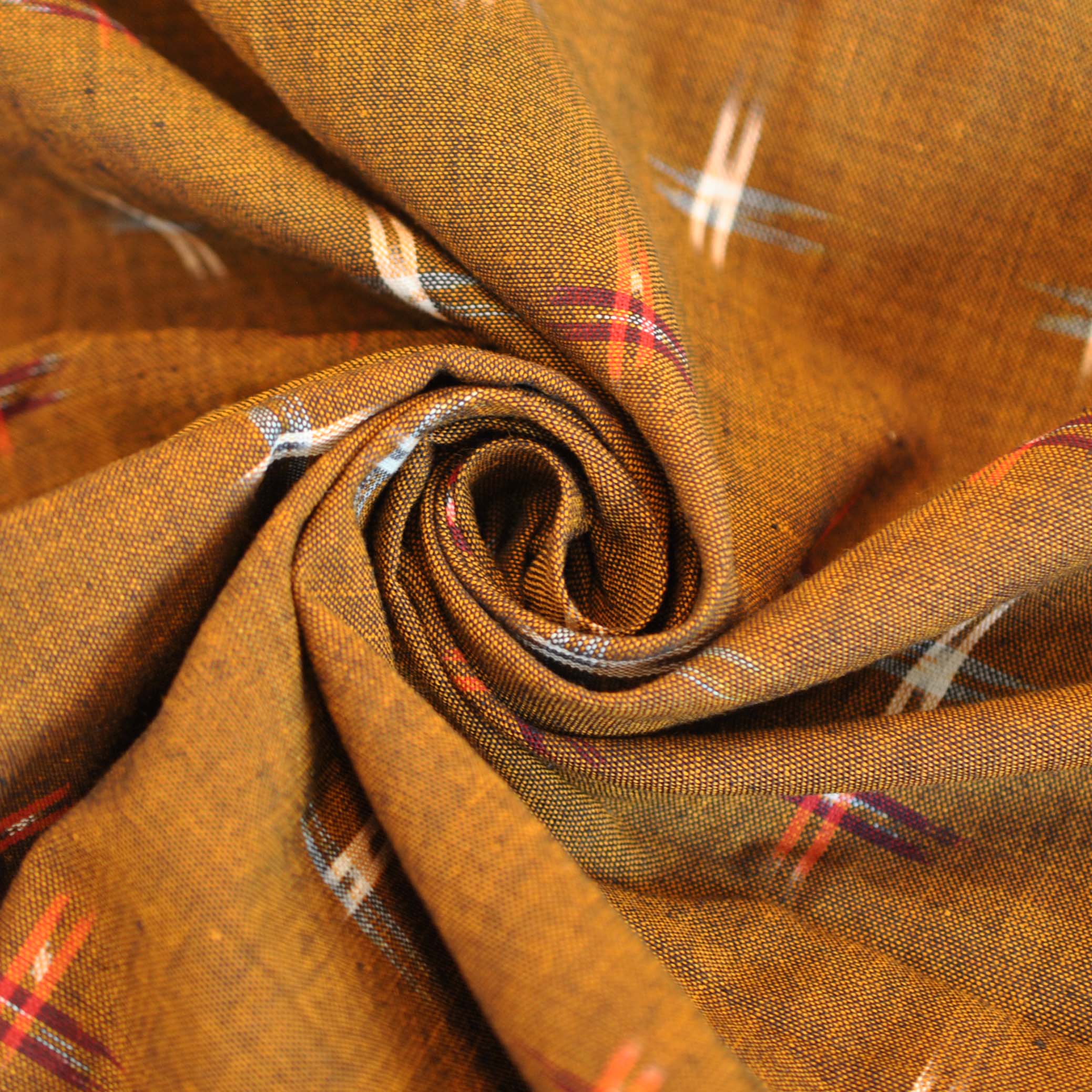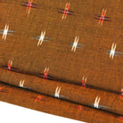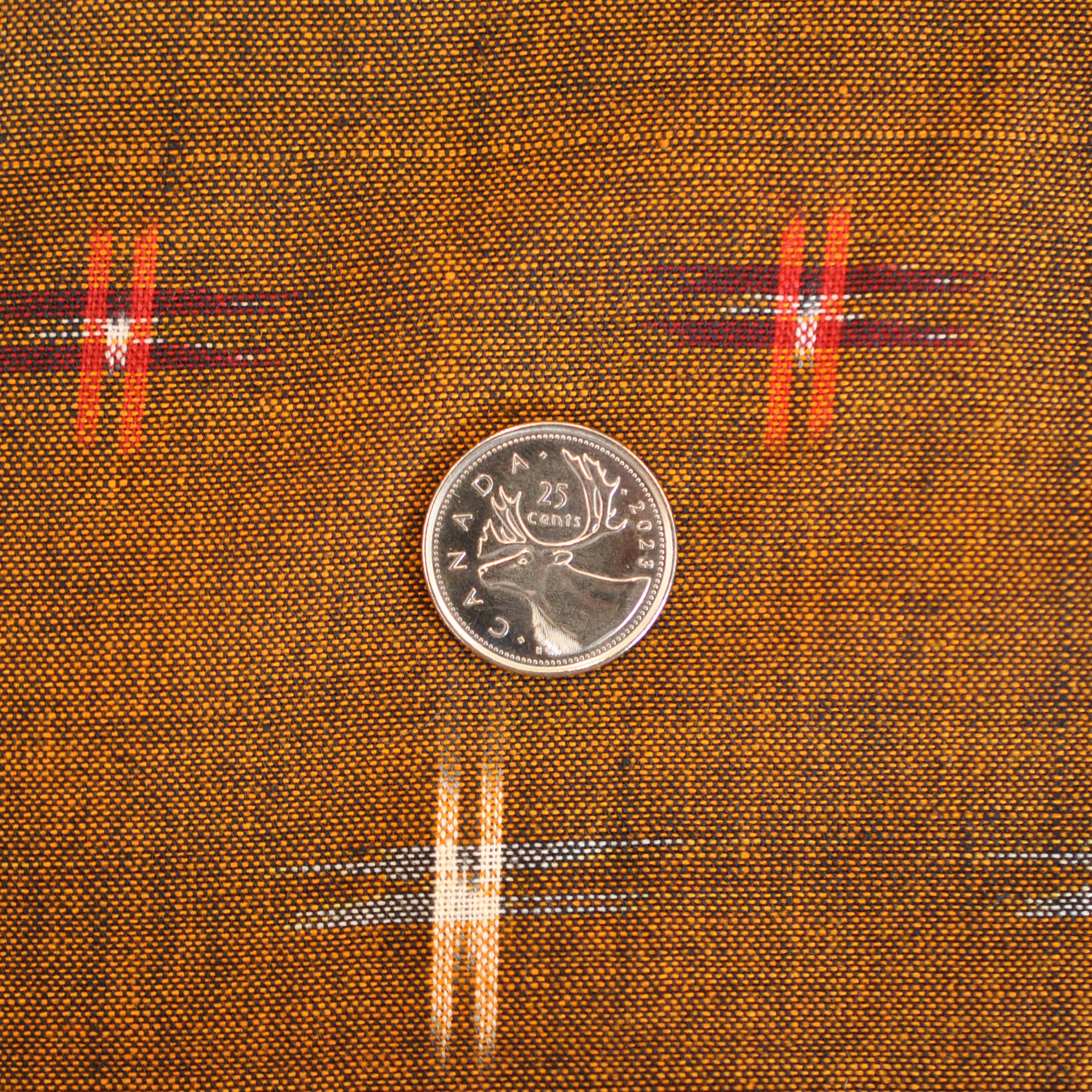 A rich caramel cloth made up of the warp and weft being a deep orange and black with scattered cross-hatch motif in mixture of warm tones.