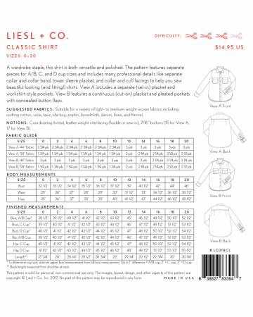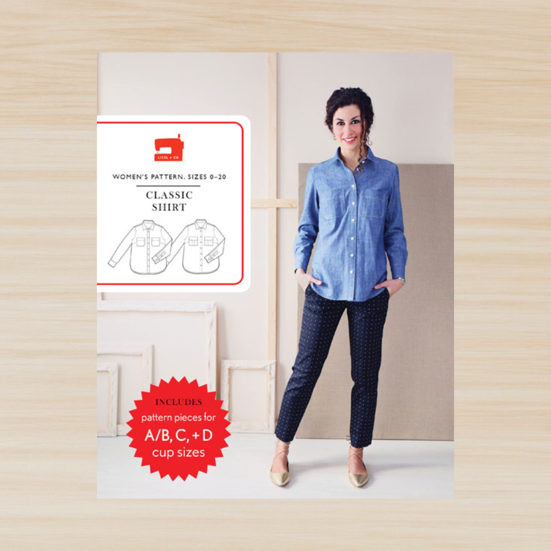 A wardrobe staple, this shirt is both versatile and polished. The pattern features separate pieces for A/B, C, and D cup sizes and includes many professional details like separate collar and collar band, tower sleeve placket, and collar and cuff facings to help you sew beautiful looking (and fitting!) shirts. View A includes a separate (set-in) placket and workshirt-style pockets. View B features a continuous (cut-on) placket and pleated pockets with concealed button flaps.