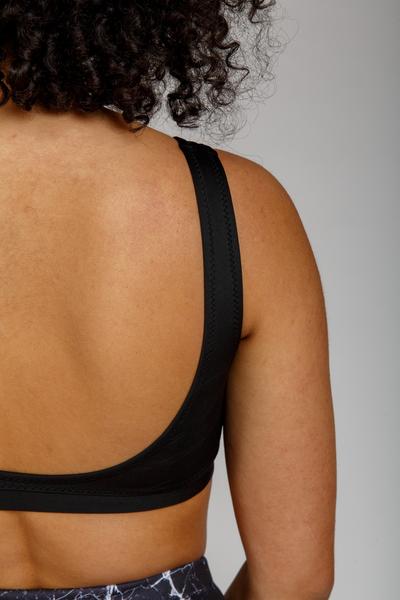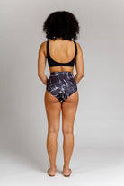 View A is a one piece swimsuit with low scoop back, shelf bra, ties at the back, gusset and ample coverage. View B is an athletic inspired bikini top wih a high scoop back. View C is a low rise bikini bottom with gusset and ample coverage. View D is an athletic inspired high waisted bikini bottom with gusset and ample coverage. All versions are able to be fully lined