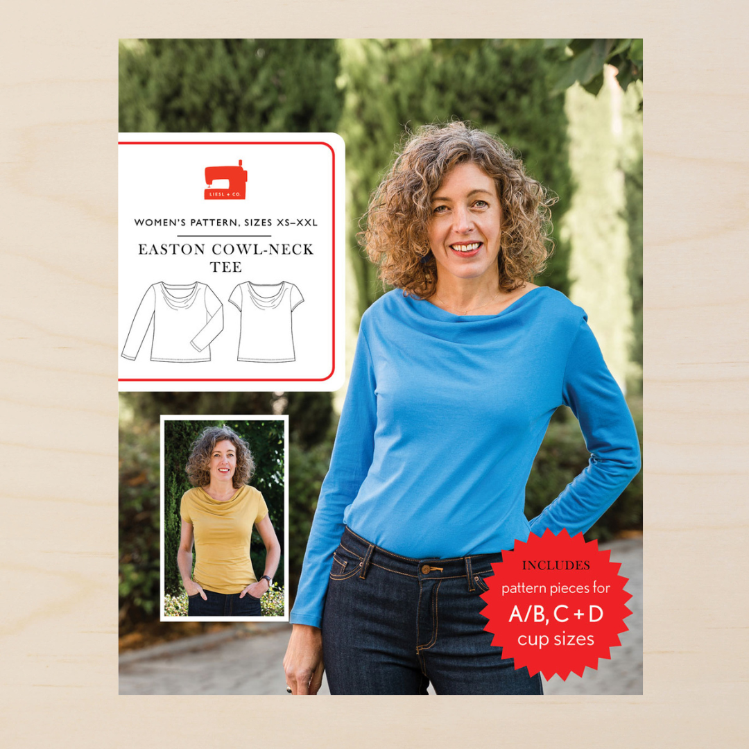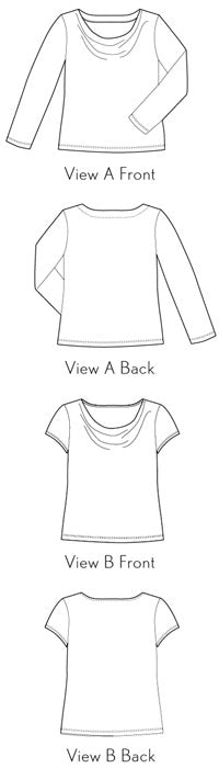This classic knit, cowl-neck top is both flattering to wear and easy to sew. View A includes long sleeves and a wide, topstitched back facing while View B features short sleeves and a narrow, bias-cut back facing. Combine or switch these elements to make your perfect top. The pattern includes cup sizes to help you get the perfect fit, and it can be sewn from lightweight drapey knits for a casual, professional, or dressy look.