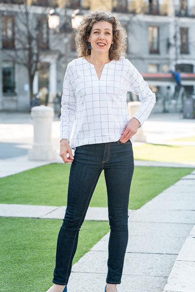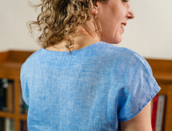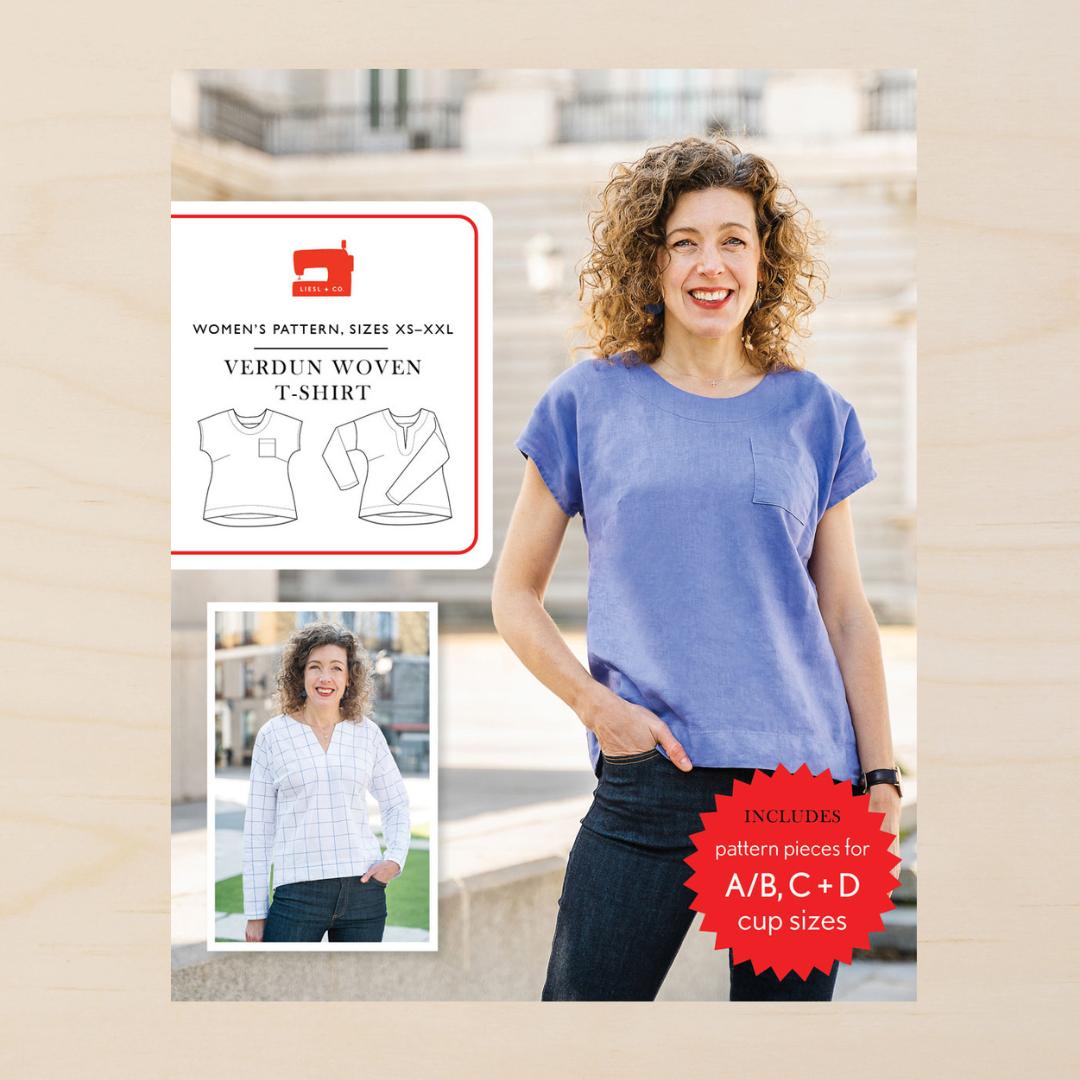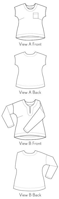 The Verdun makes a relaxed-fit woven T-shirt with dropped shoulders, a flattering shape, a faced hem that is longer in back than in the front, and a scooped neck with facing. View A includes cut-on short sleeves and a front pocket while View B has a V-notched neckline and long sleeves.