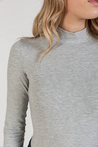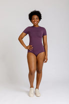View A is a short sleeve tee with crew neckline. View B is a 3/4 sleeve tee with v neckline. View C is a long sleeve tee with turtle neck. View D is a short sleeve bodysuit with crew neckline. View E is a ¾ sleeve bodysuit with v neckline. View F is a turtleneck bodysuit with long sleeves.