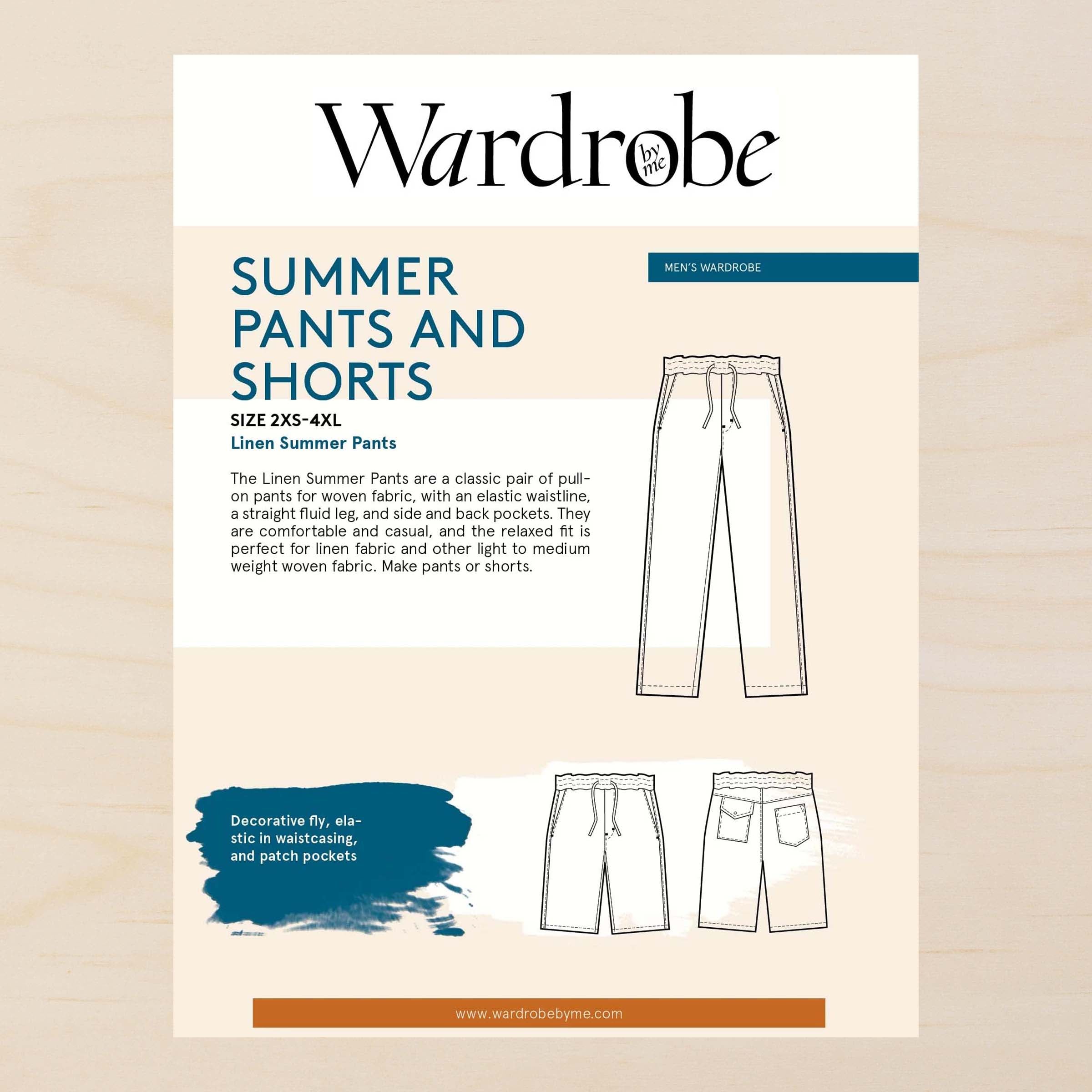 Men's summer pants sewing pattern is a classic pair of pull-on pants in woven fabric. The side and back pockets are generous, and the fit of the pants is straightforward and fluid.
