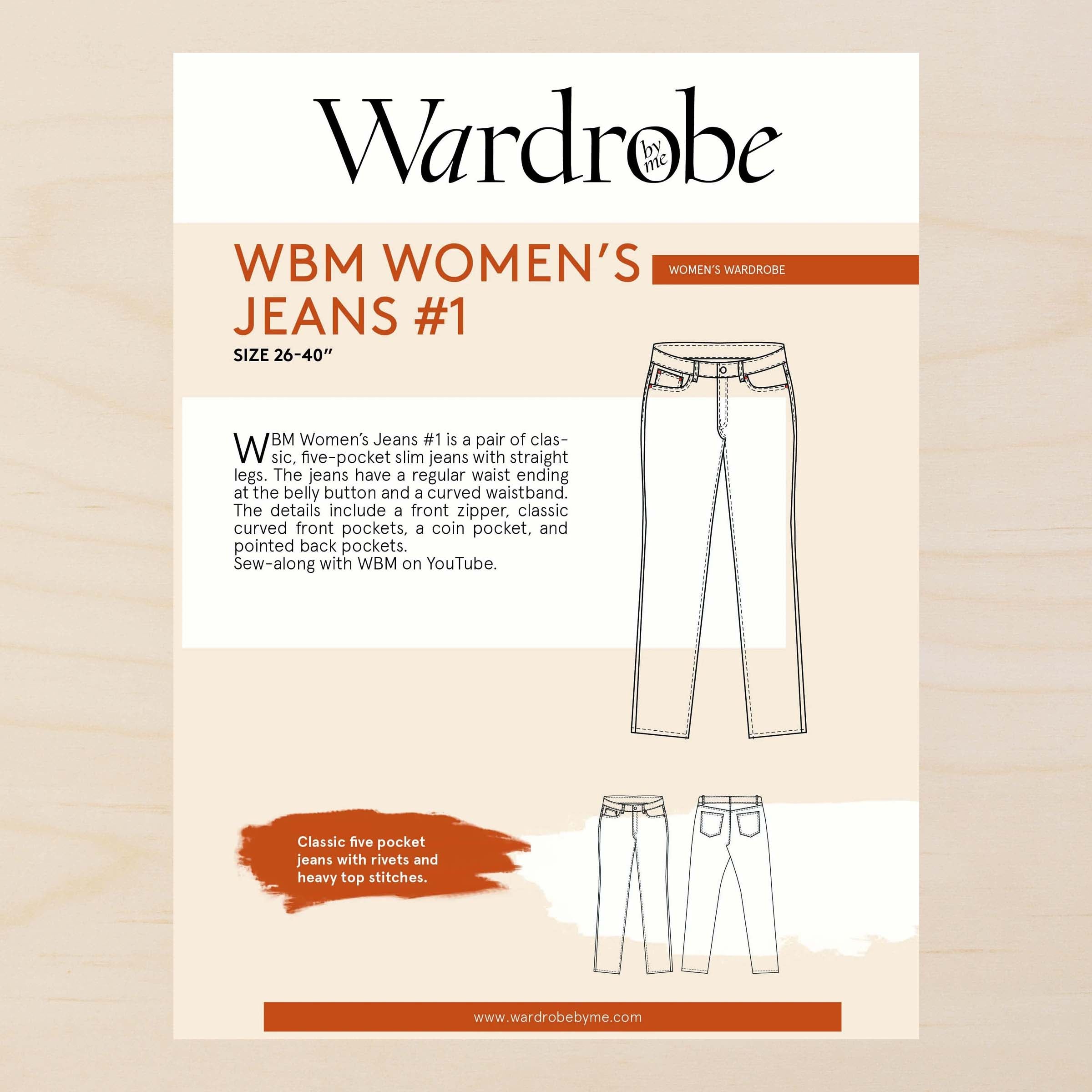 Women's Five-pocket jeans sewing pattern is a pair of classic, five-pocket slim jeans with straight legs. The jeans have a regular waist ending at the belly button and a curved waistband.