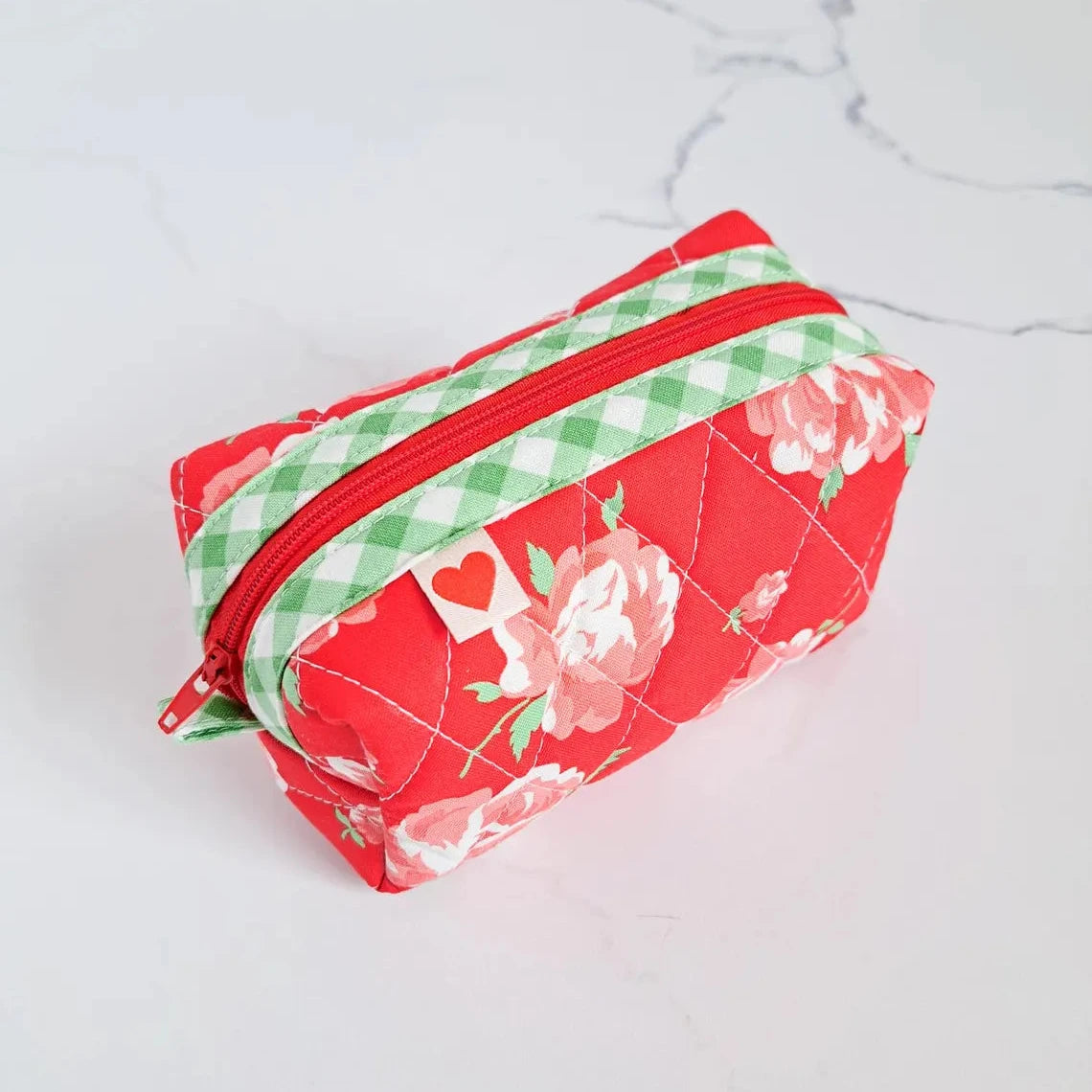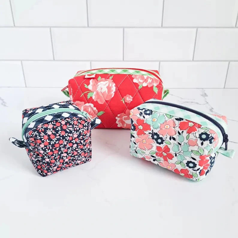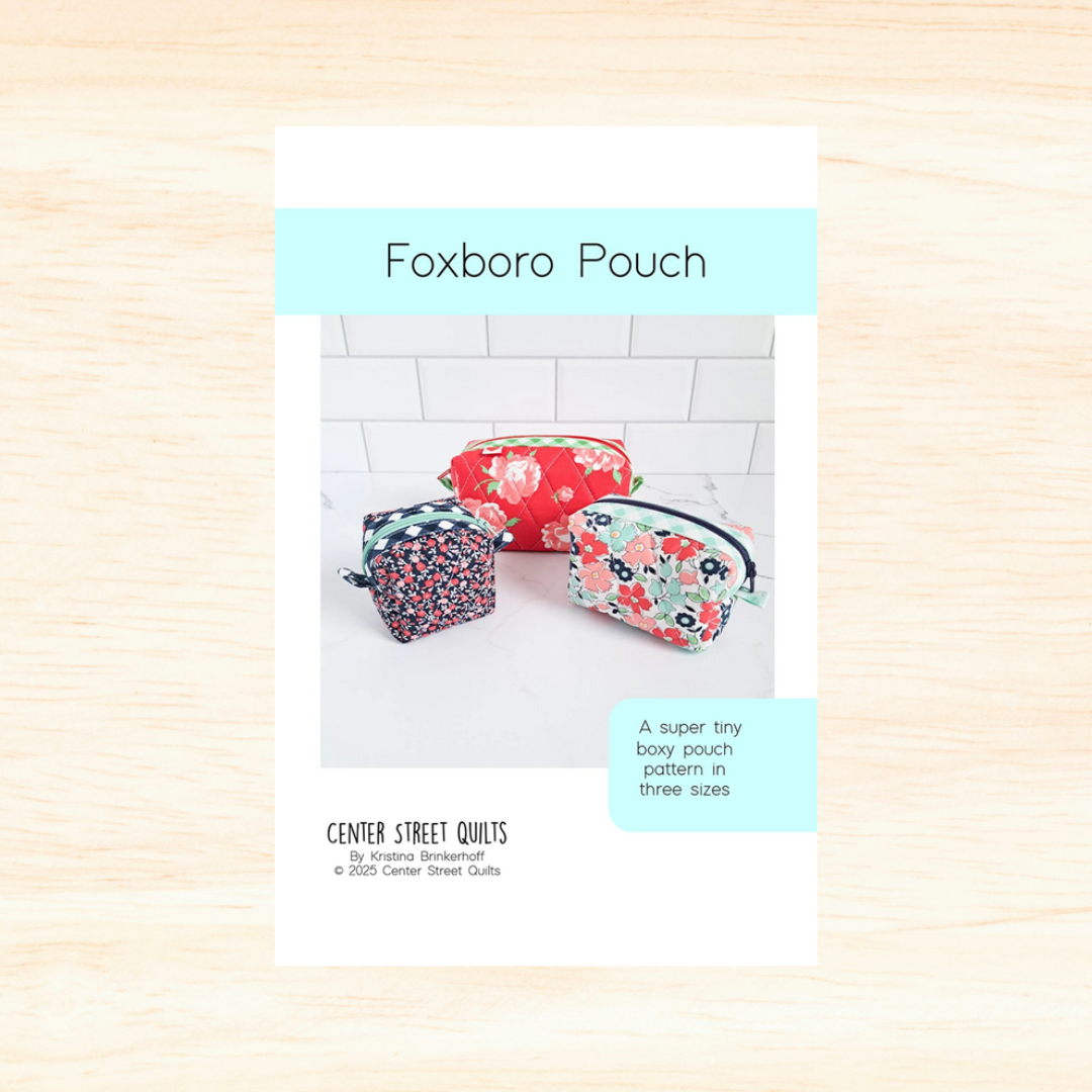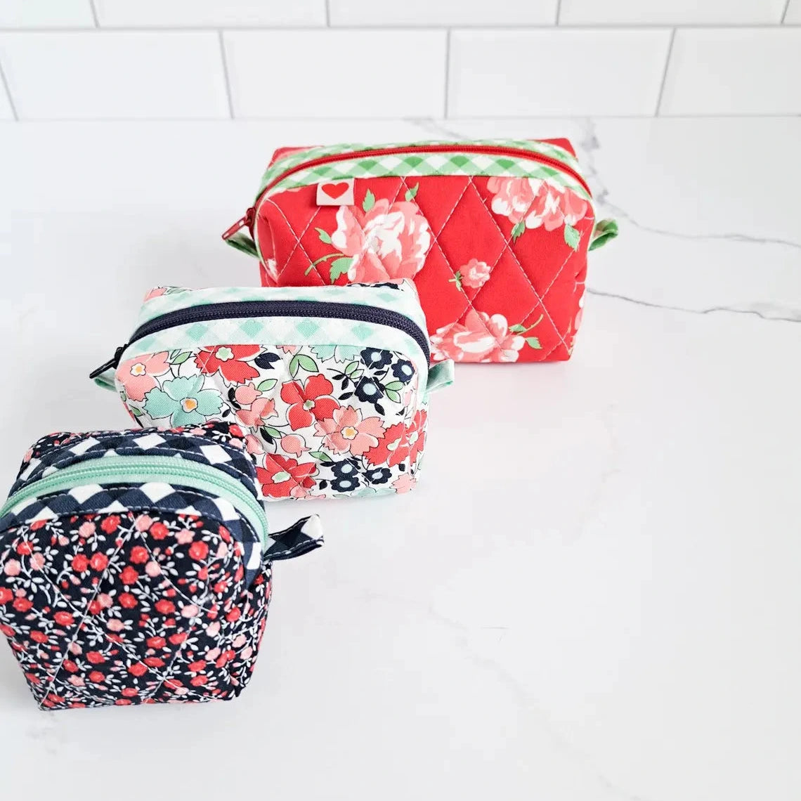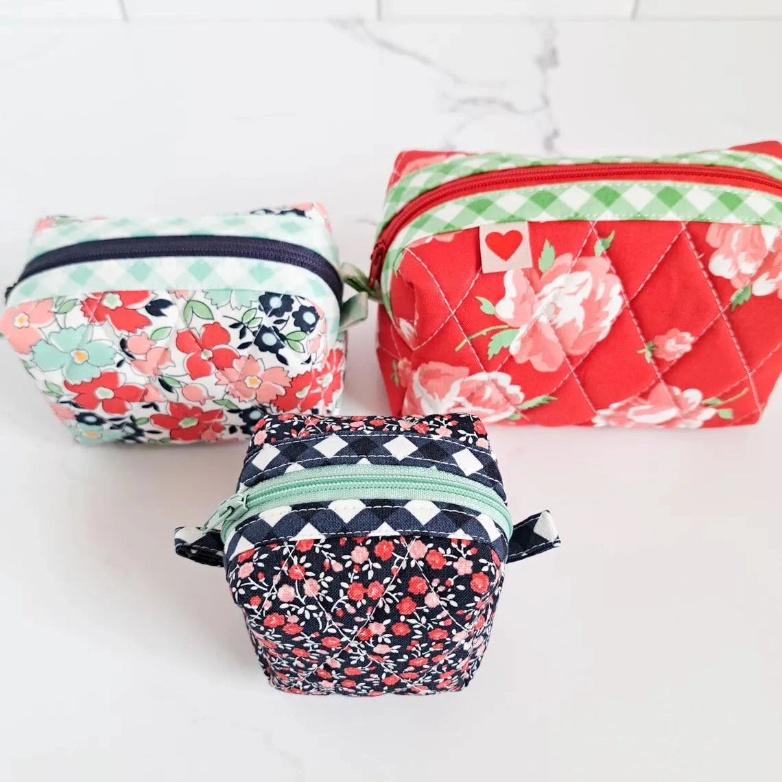 The Foxboro Pouch Pattern is a quilted zipper pouch pattern that includes three size options. These tiny boxy pouches are perfect for storing your tiniest belongings: binding clips, safety pins, spools of thread, small sewing notions, earbuds, a deck of cards, band-aids, makeup, jewelry, etc.