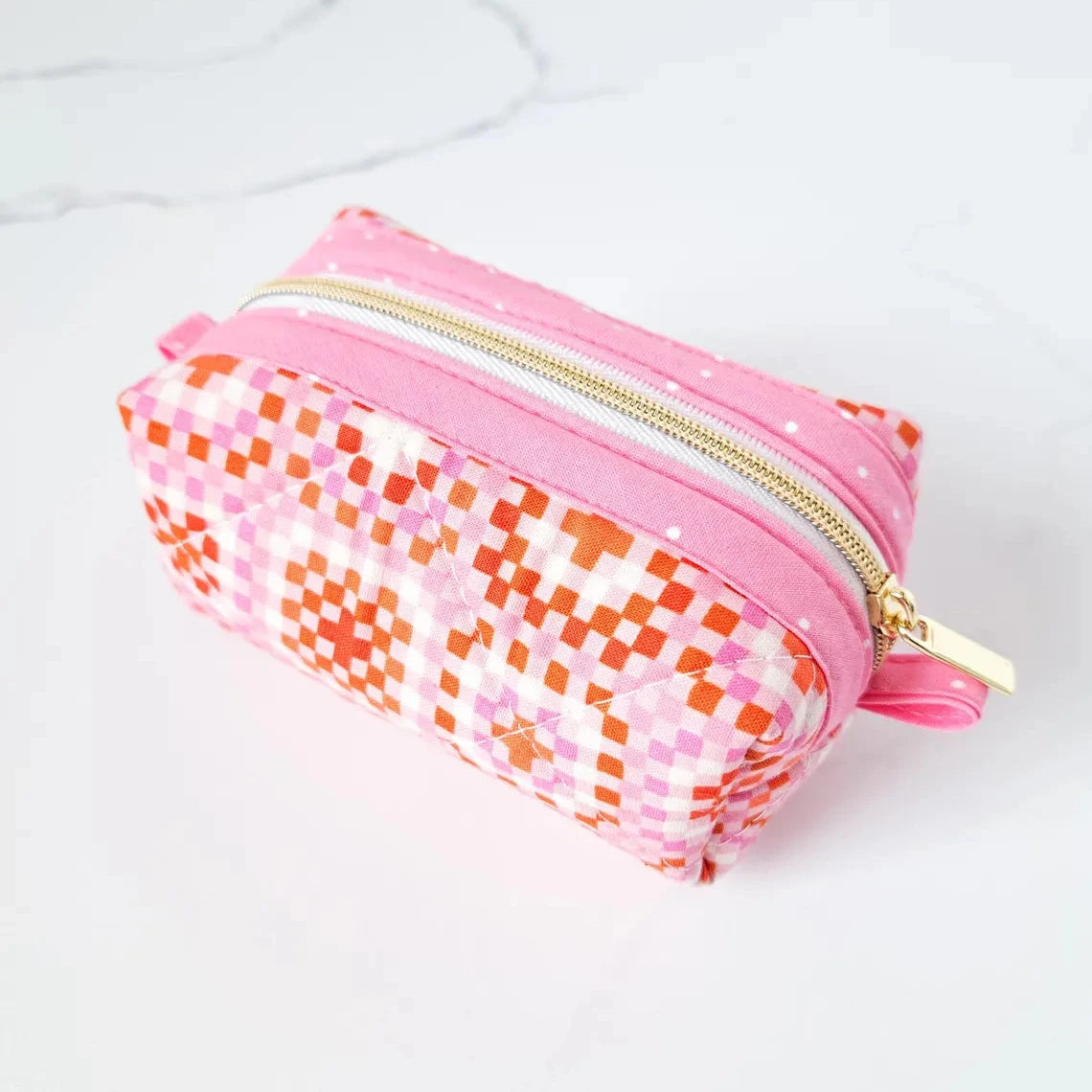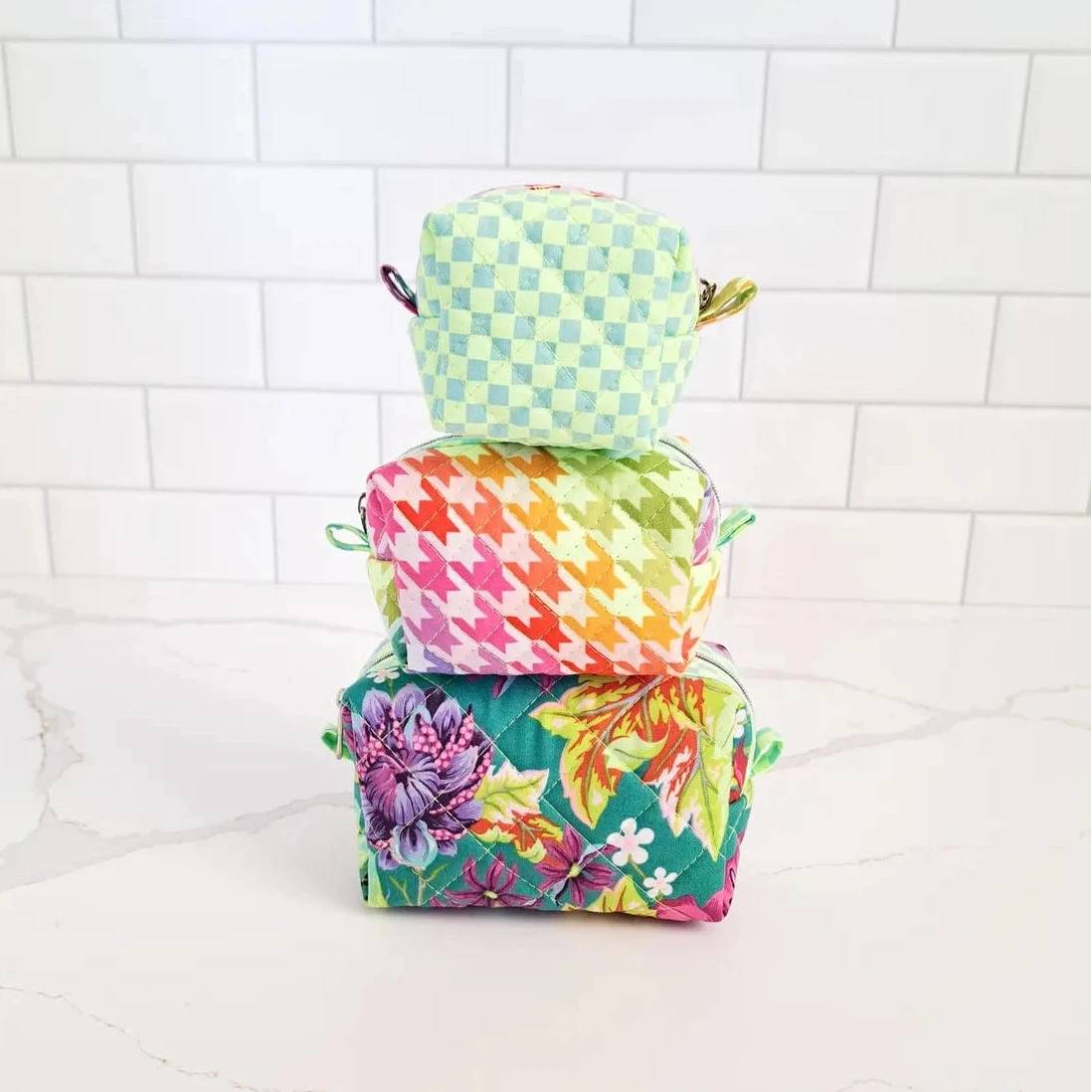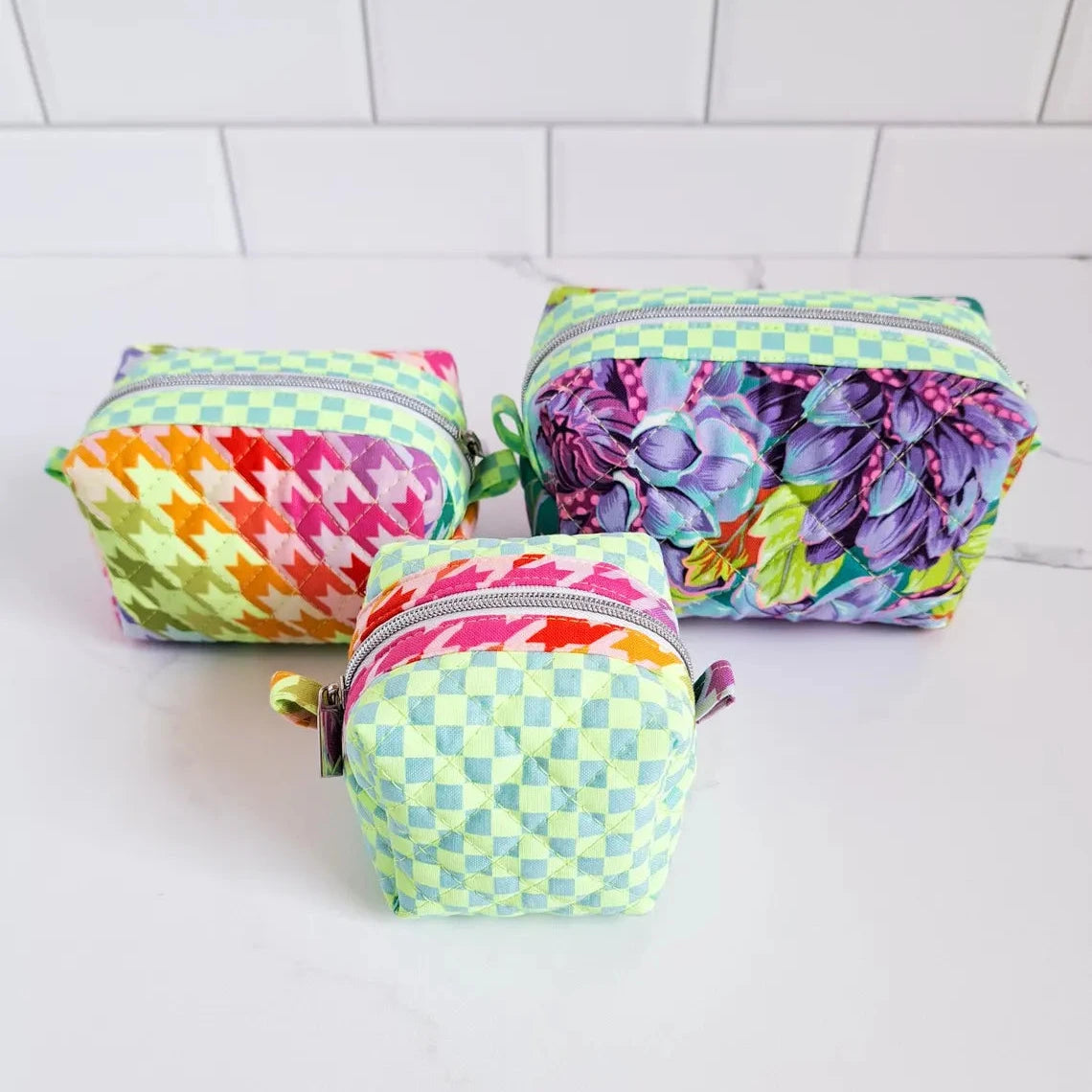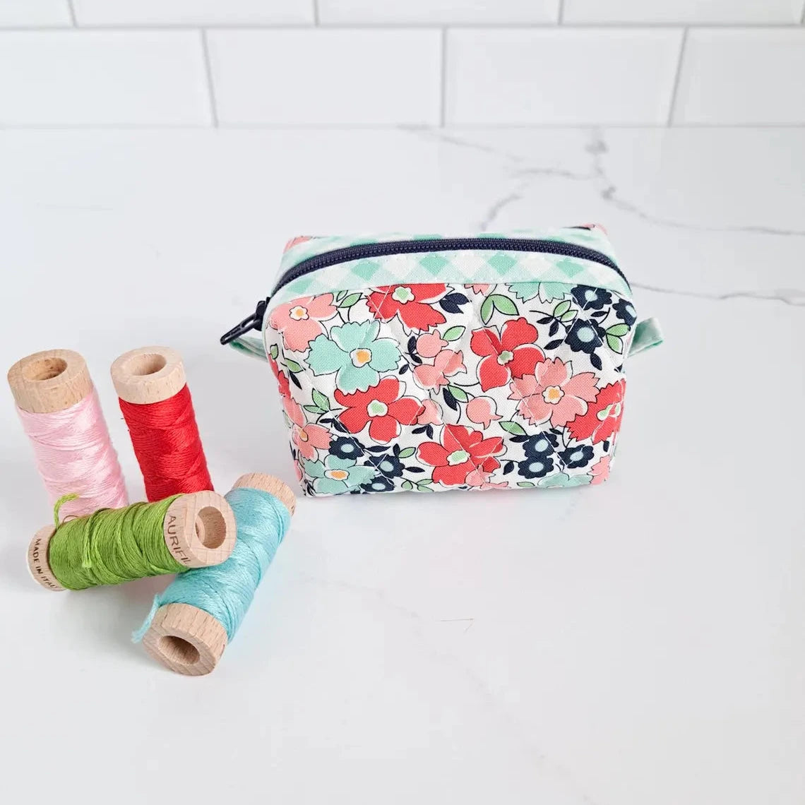 The Foxboro Pouch Pattern is a quilted zipper pouch pattern that includes three size options. These tiny boxy pouches are perfect for storing your tiniest belongings: binding clips, safety pins, spools of thread, small sewing notions, earbuds, a deck of cards, band-aids, makeup, jewelry, etc.