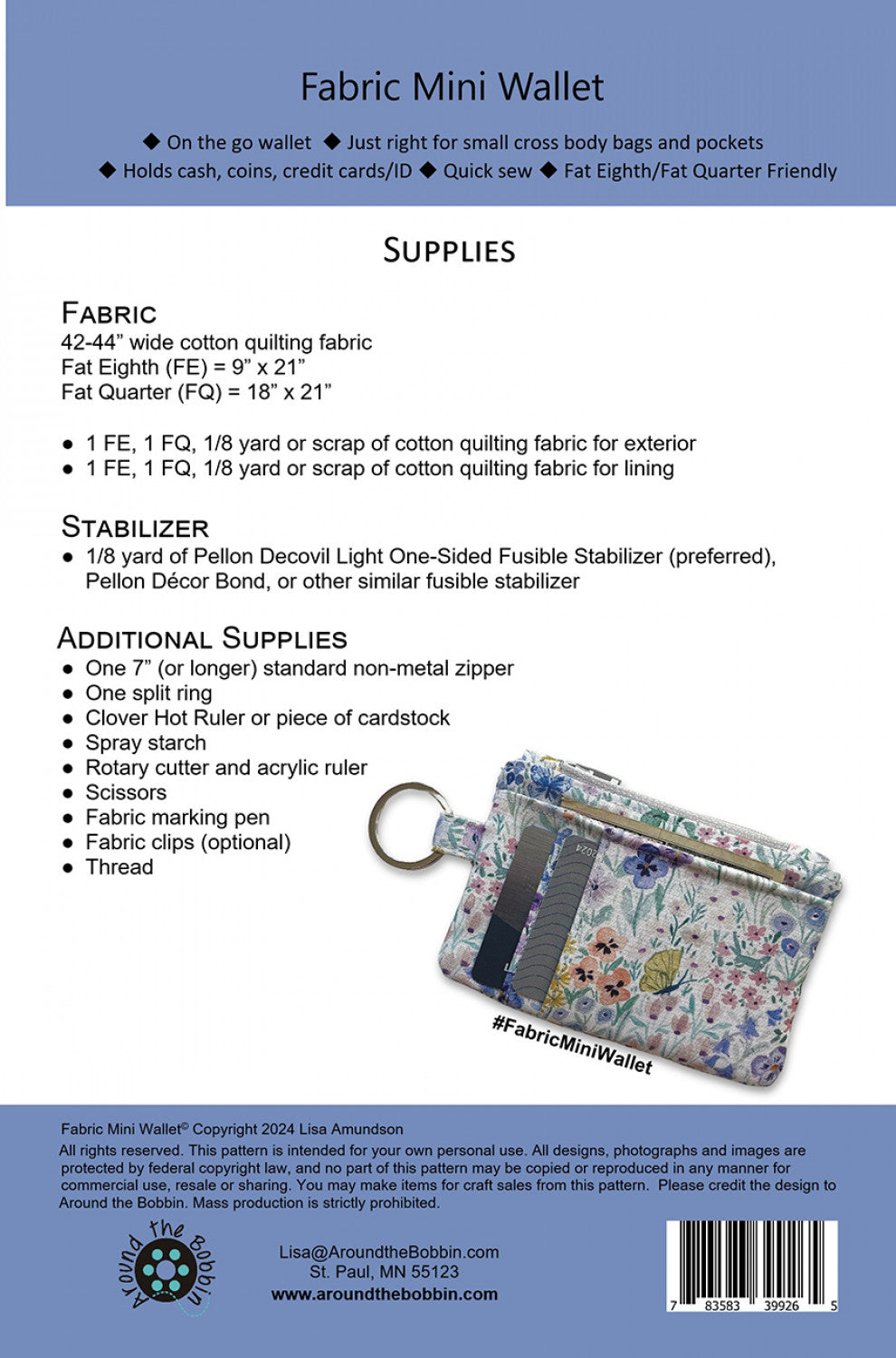 These fabric mini wallets are small but mighty! With a zip closure, front pocket and 2 credit card slots, they hold the essentials for on-the-go outings. Great for small cross body bags and pockets. Finished size is approximately 3 in high x 4 3/4 in wide.