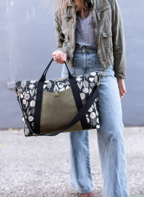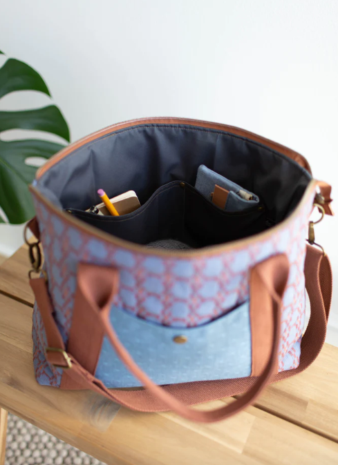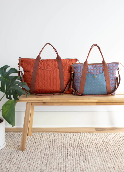 A versatile zippered top tote bag in two sizes to sew! Features an easy-access front pocket, reinforced base, crossbody strap, and a roomy interior with a slip pocket. Customize yours by quilting!