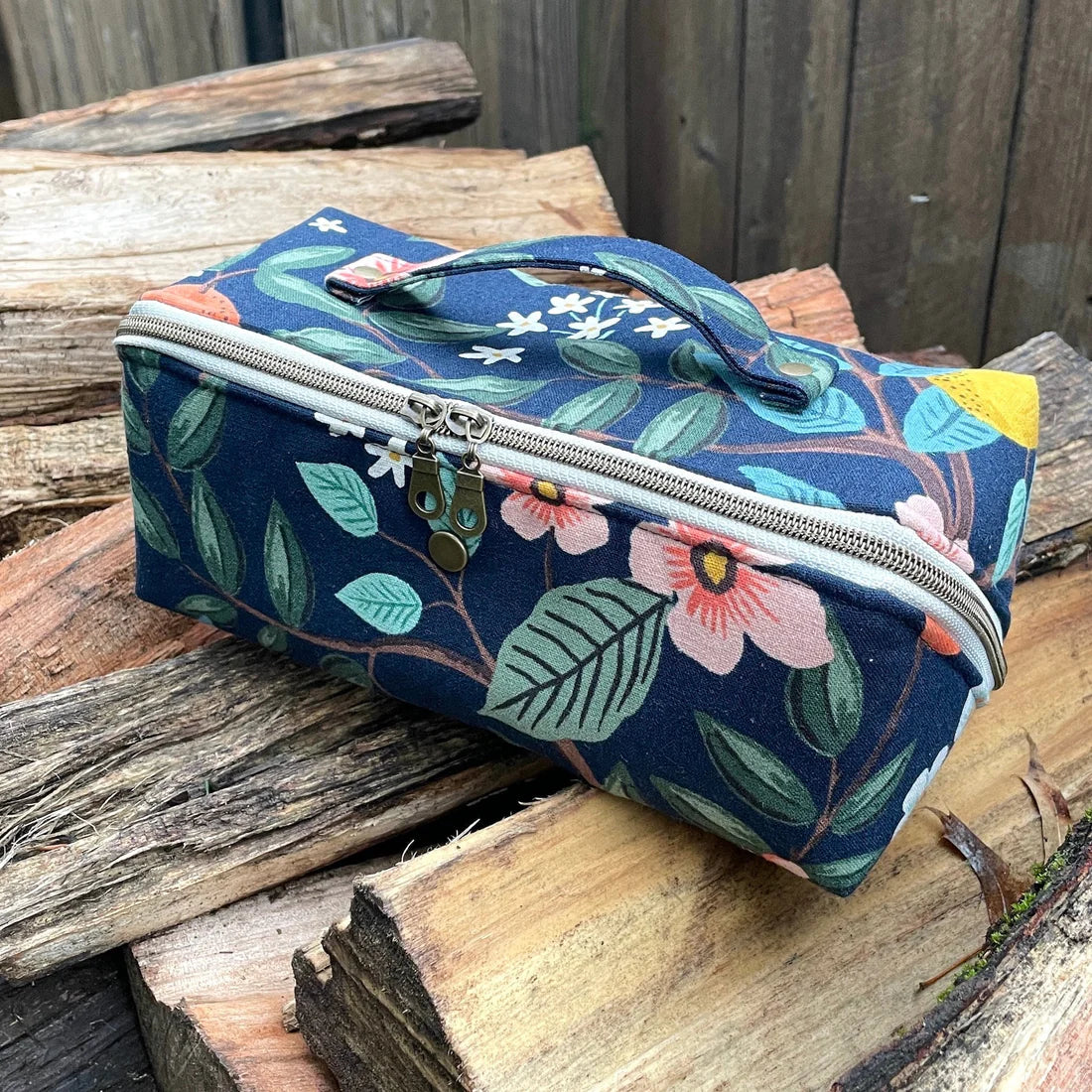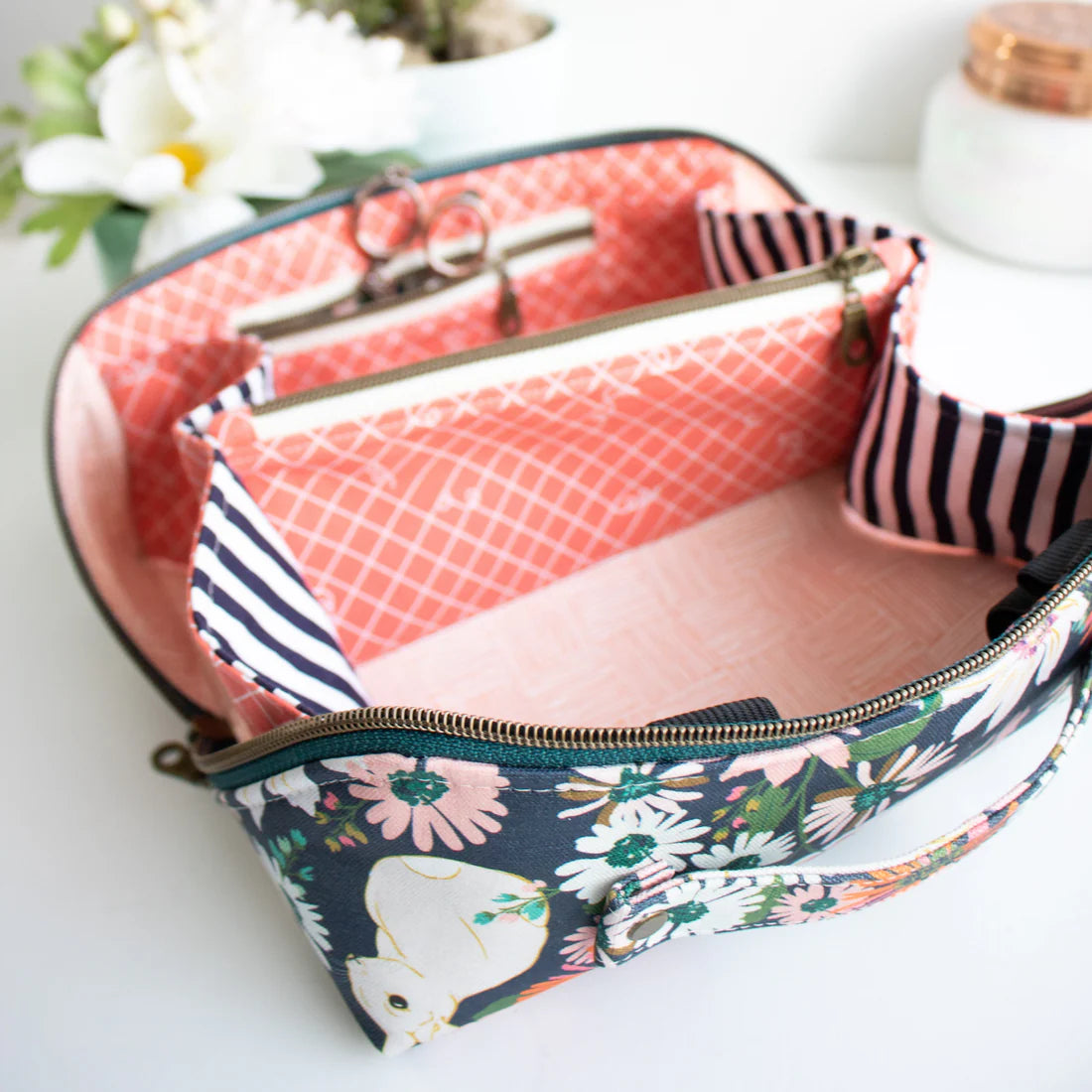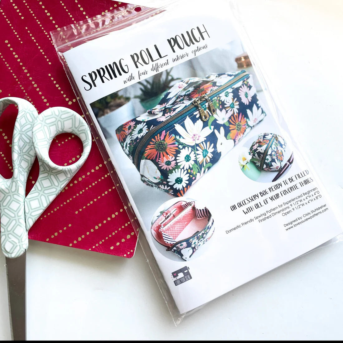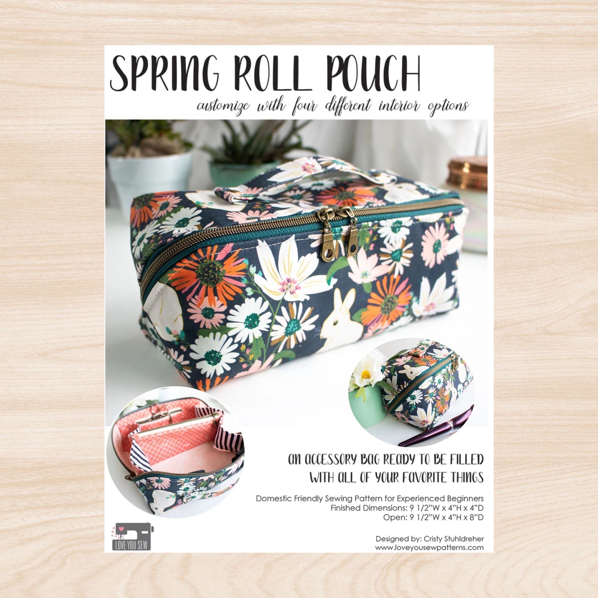 Just like my favorite food, the Spring Roll Pouch wraps up so much goodness in one little package. This multi-purpose accessory bag has a great rectangular shape and an angled zipper at the side, making the pouch open to twice its footprint! The main zipper opens to reveal a divided compartment with ample room for all of your craft supplies, cords, skin care and even toys!