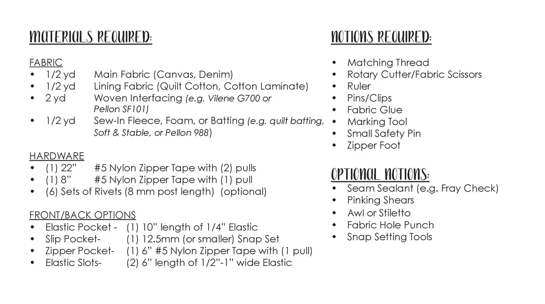 This pattern assumes you know how to install zippers, rivets and snaps.