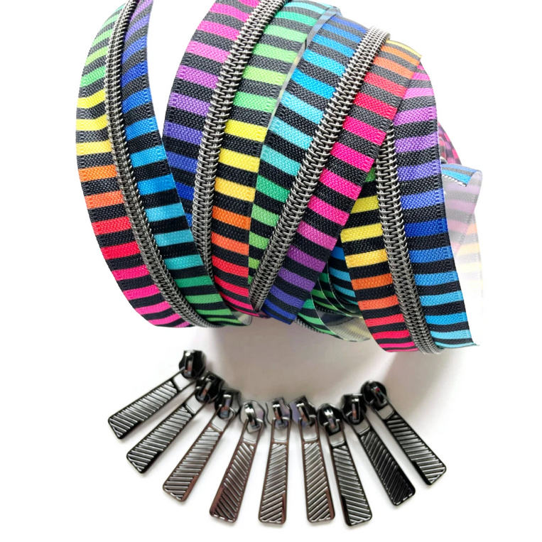 #5 Zipper Tape by the Yard - 3 Yards Gunmetal Colour Stripes Coil with 9 Pulls