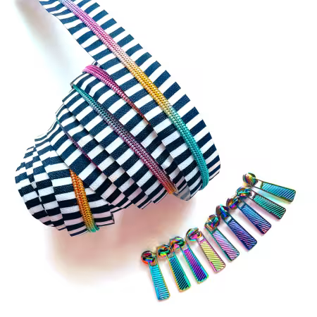 Zipper is size #5 striped black and white tape. The nylon coil teeth are rainbow, and the included 9 pulls are matching rainbow.