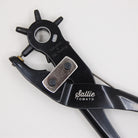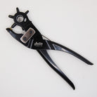 Don't be without this handy Deluxe Rotary Punch! Save time and stop making inaccurate holes by using this extremely easy-to-use tool. Simply place in between the 2 layers of fabric, vinyl, cork fabric, or leather to punch your desired hole through them. Very useful when adding rivets, bag feet, leather lace, and more! This punch features a strong steel body, brass anvil, non-slip handle grips. The adjustable locking wheel has 6 tubes in sizes 5/64in, 3/32in, 1/8in, 9/64in, 5/32in, 3/16in. Threaded steel punch tubes can be replaced when damaged or dull.