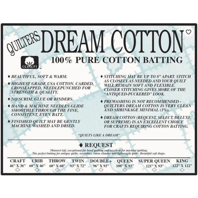 - Prewashing is not recommended as Dream Cottons is exceptionally free of cotton seed remnants and shrinkage is minimal.