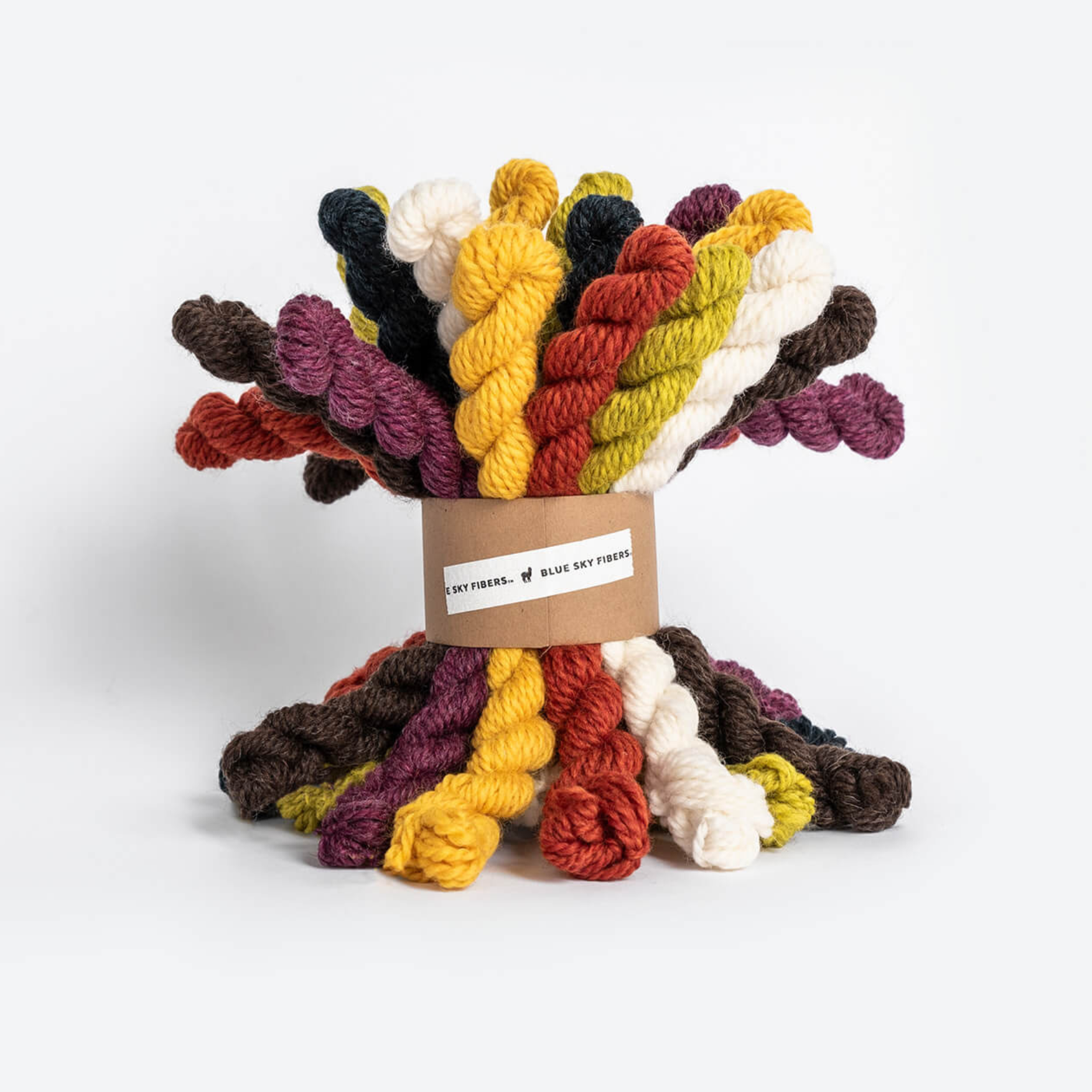 Kit includes: 21 mini hanks Blue Sky Fibers Woolstok Worsted (100% Highland Peruvian Wool; 5g/12yds each)
