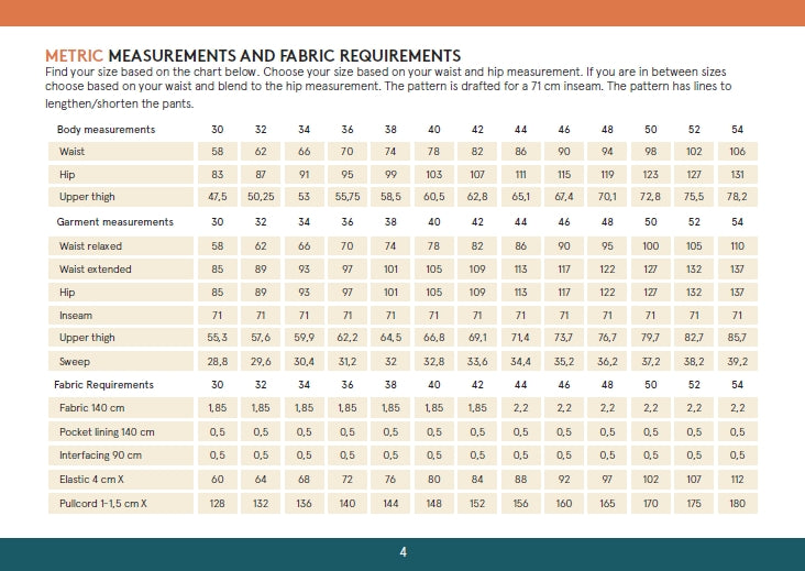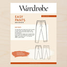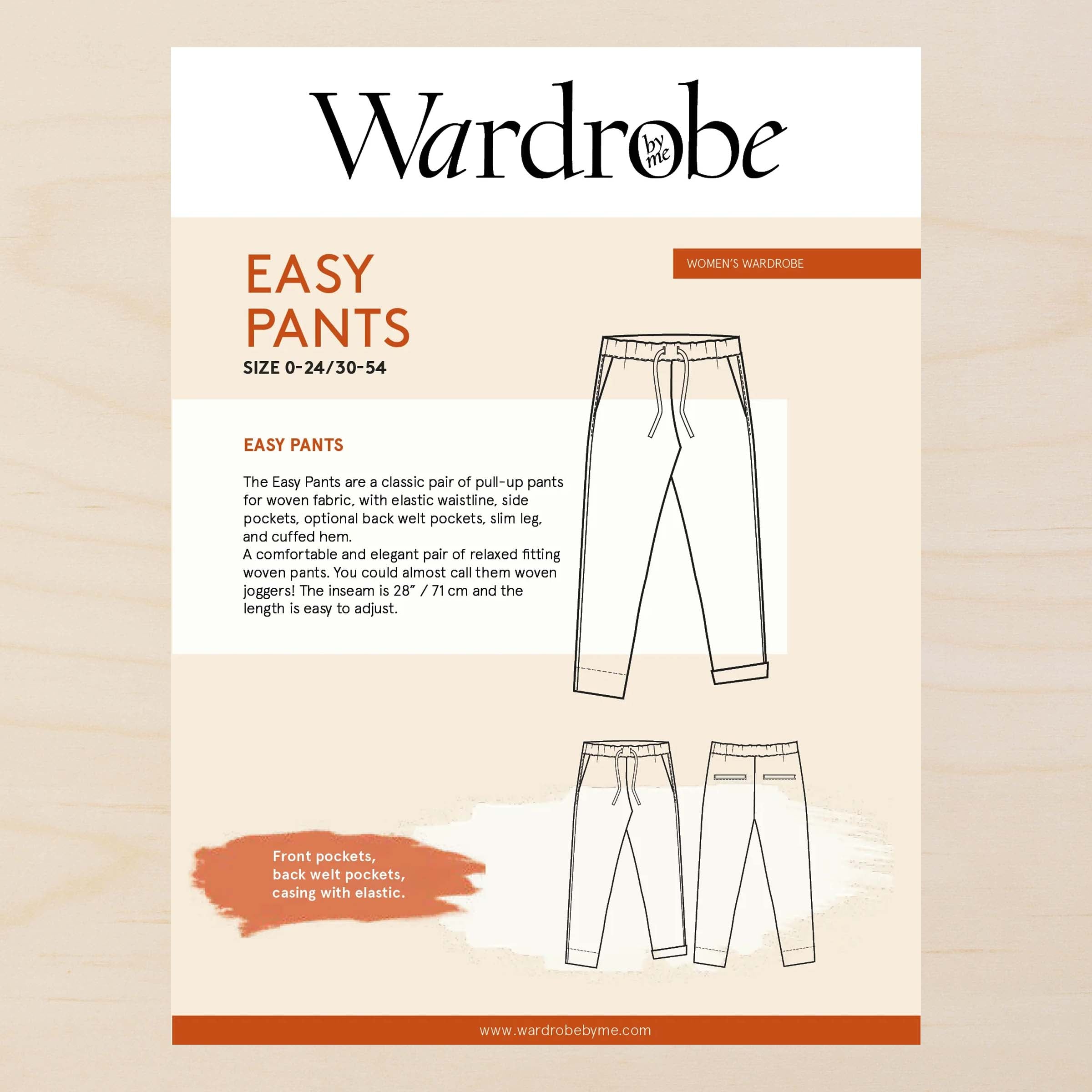 The Easy pants are a classic pair of pull-up pants for woven fabric, with elastic waistline, side pockets, optional back welt pockets, slim leg, and cuffed hem.