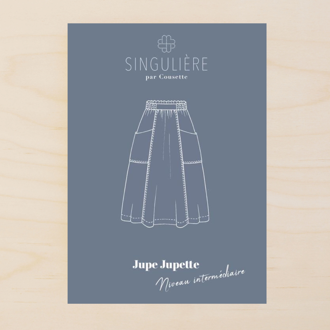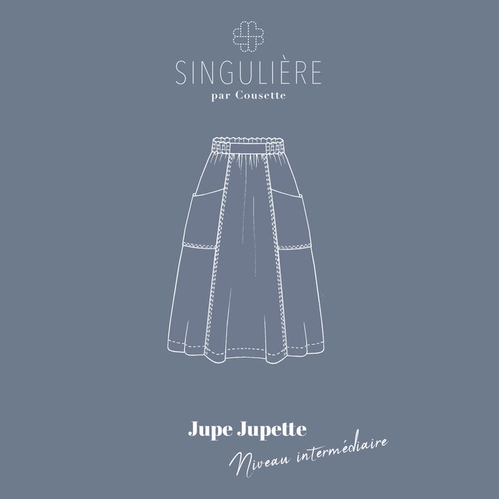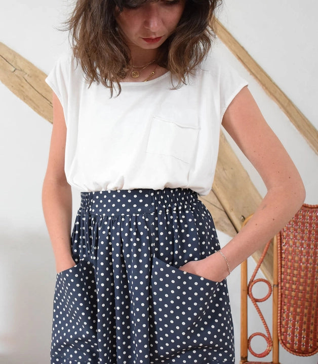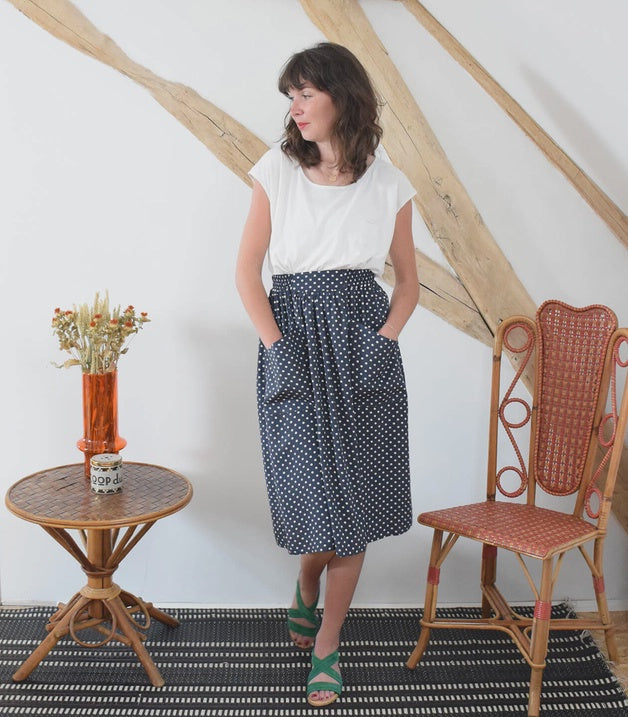 Jupette is the skirt that you put on without thinking about it and that combines comfort and elegance in all simplicity. With its large patch pockets taken in the side seams and its wide elasticated waistband only on the sides and back, Jupette draws a pretty silhouette. Its double stitched seams bring a little touch of originality to the model.