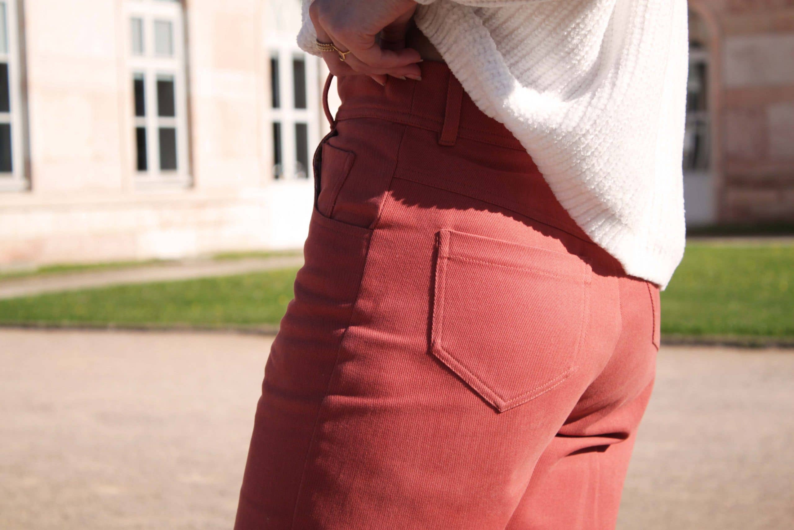 Jade are a straight cut trousers that works all year round depending on the chosen fabric. It features two curved inset pockets on the front with a watch pocket inside the left pocket. The back has a V-shaped yoke and two patch pockets. Jade is fastened by a fly front zipper and a button.