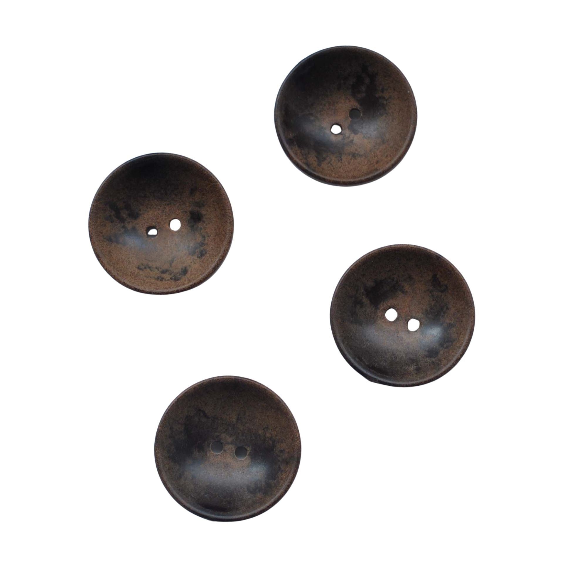 Wooden button with a convex shape and two holes.