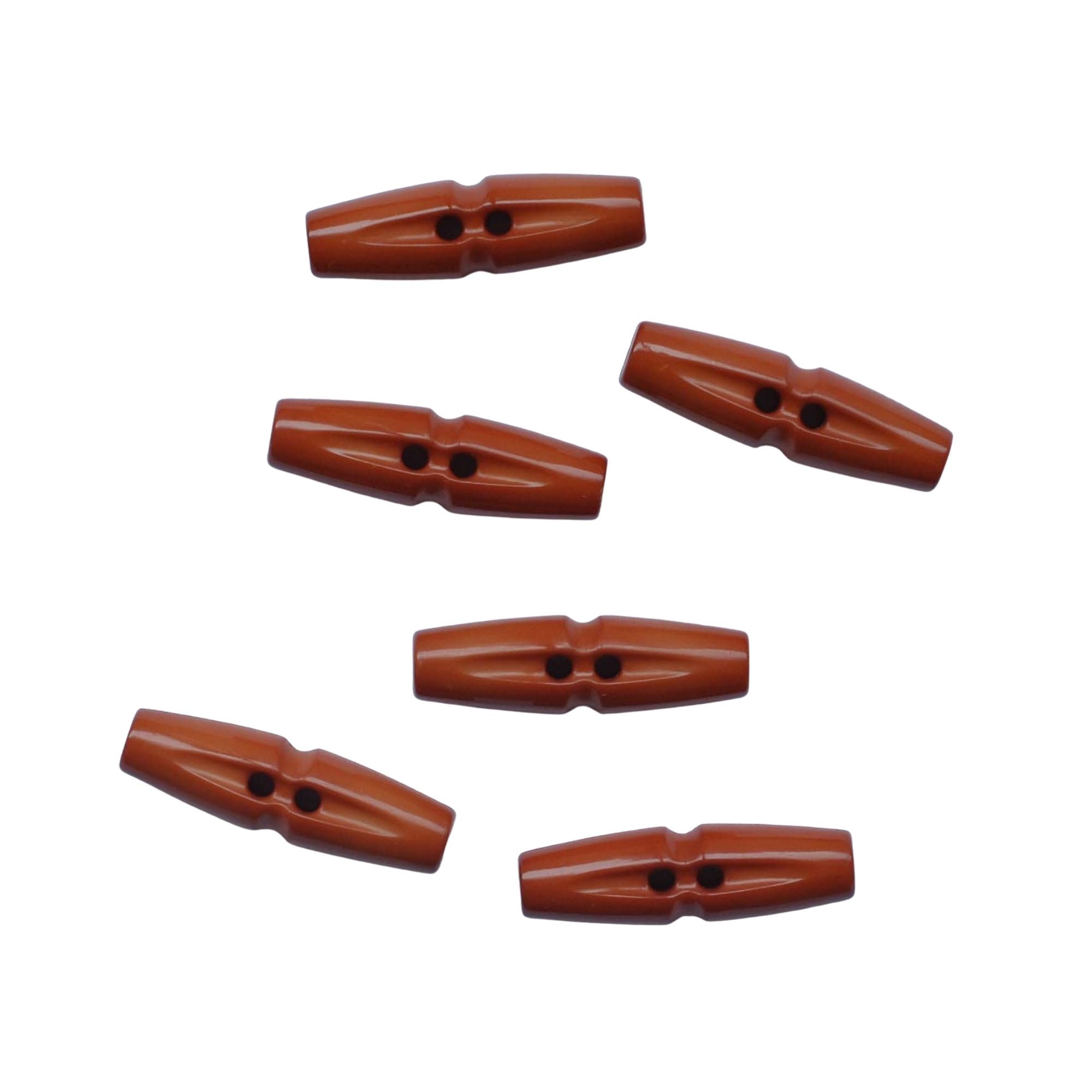 Polyester toggle shape and two holes.