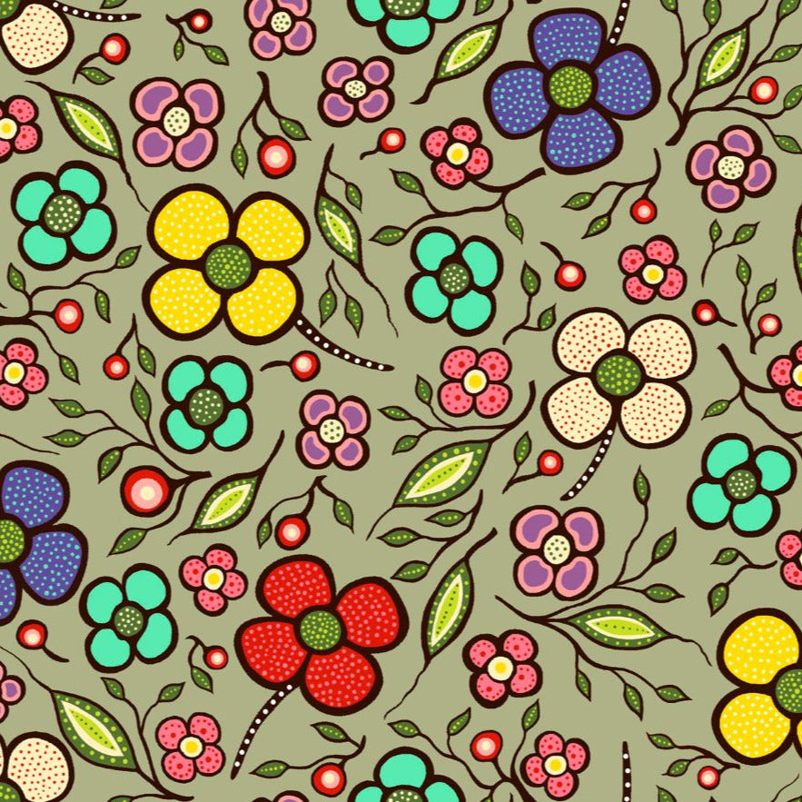 Designed to celebrate Indigenous artistry, this fabric was inspired by the work of the talented Indigenous artist Audrey Armstrong. Perfect for quilting, ribbon skirts, regalia, and other creative Indigenous textile projects.