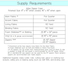 Difficulty level: Advanced. This pattern includes skills such as basting, quilting, using single fold, double fold, and bias bindings, installing zippers using two different techniques, and working with vinyl.