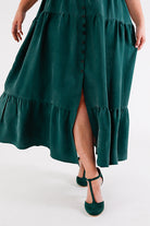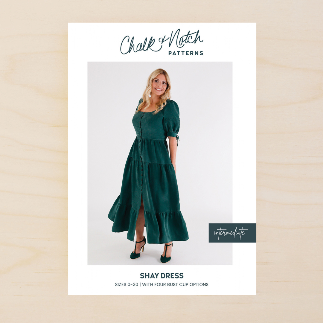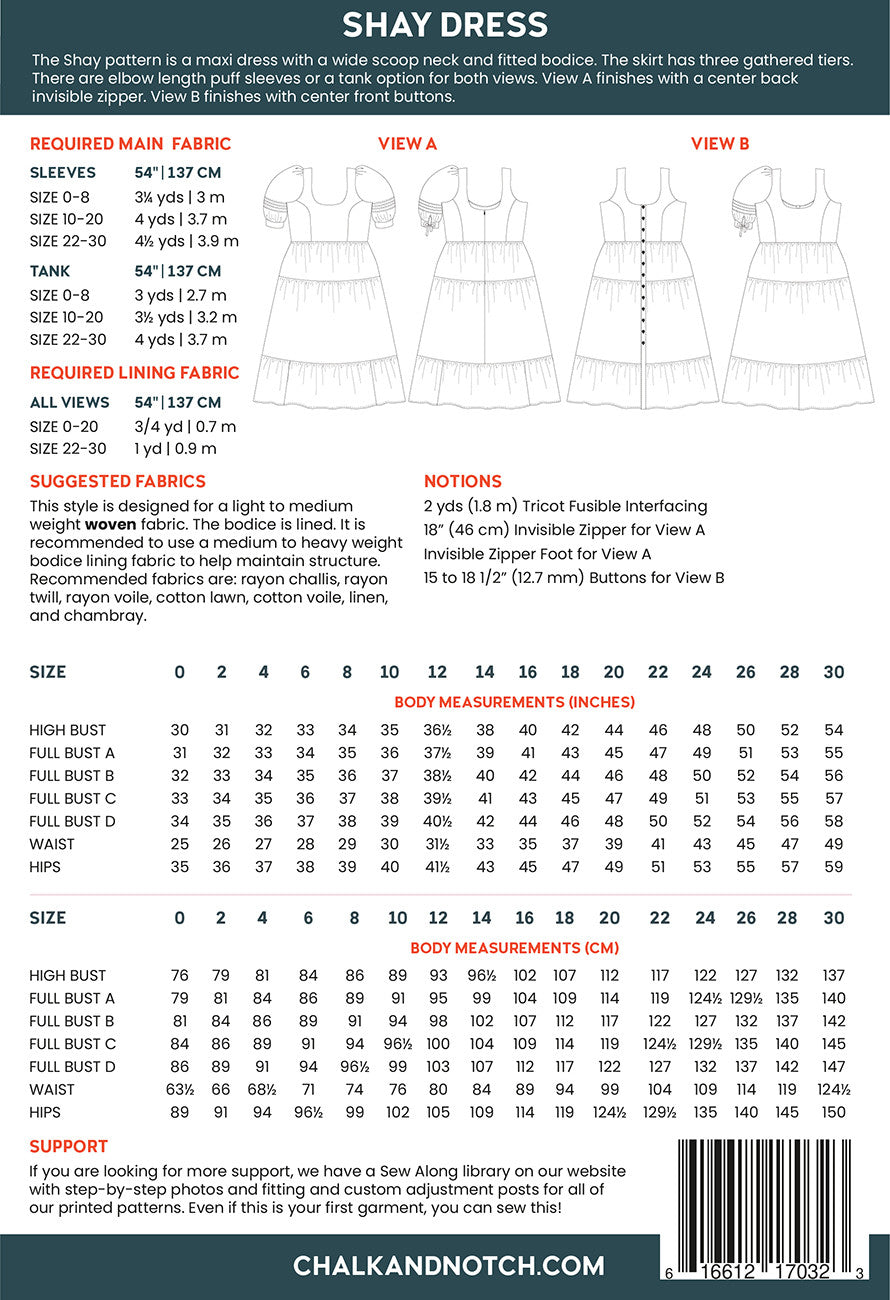 The Shay pattern is a maxi dress with a wide scoop neck and fitted bodice. The skirt has three gathered tiers. There are elbow length puff sleeves or a tank option for both views. View A finishes with a center back invisible zipper. View B finishes with center front buttons.