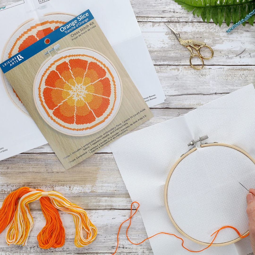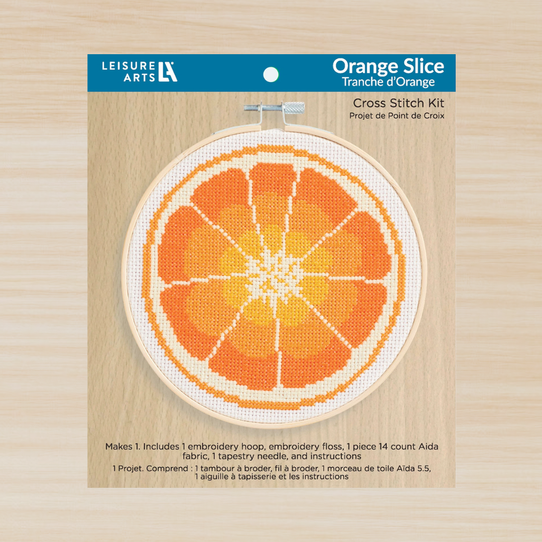 Printed cross stitch design features a vibrant coloured orange slice on aida fabric.