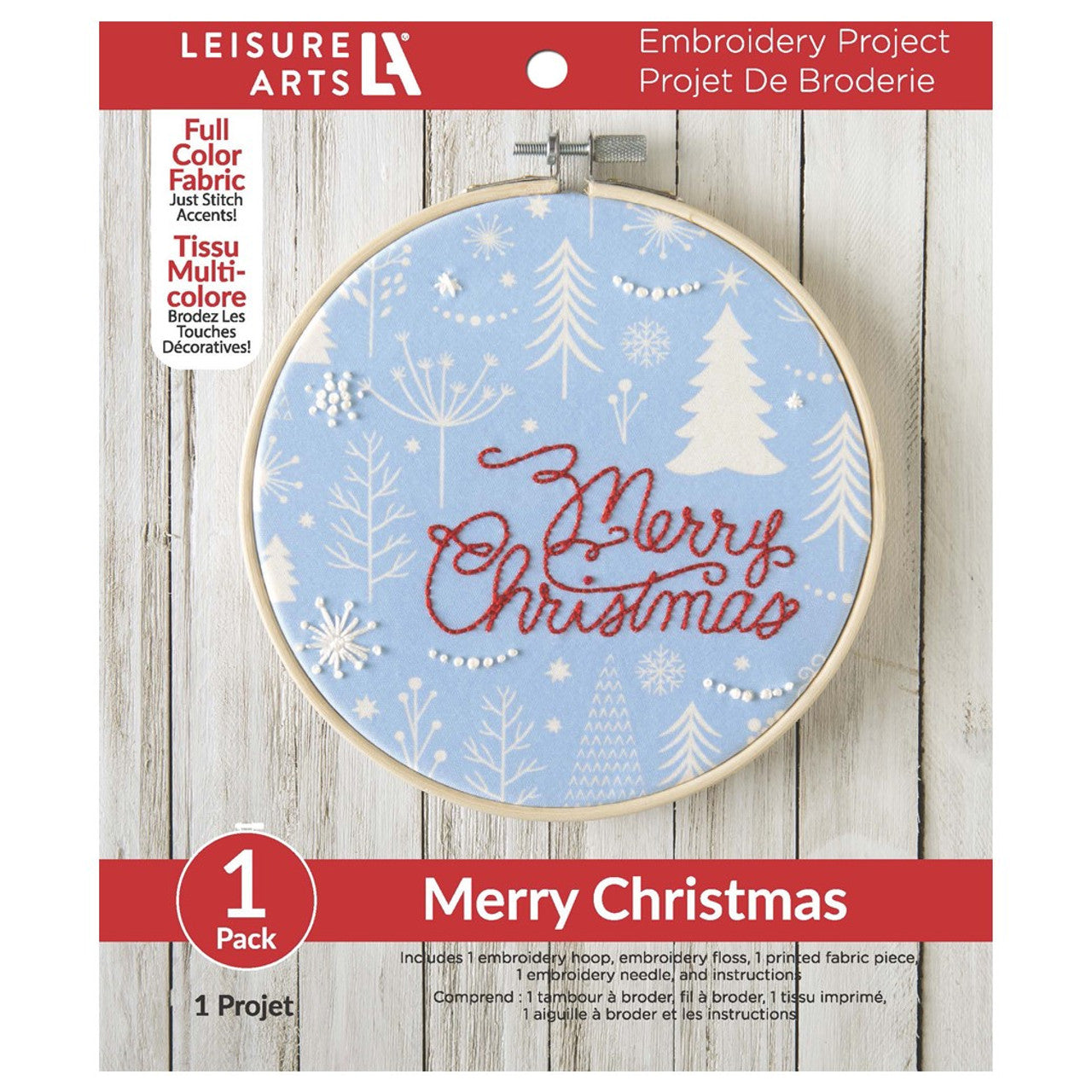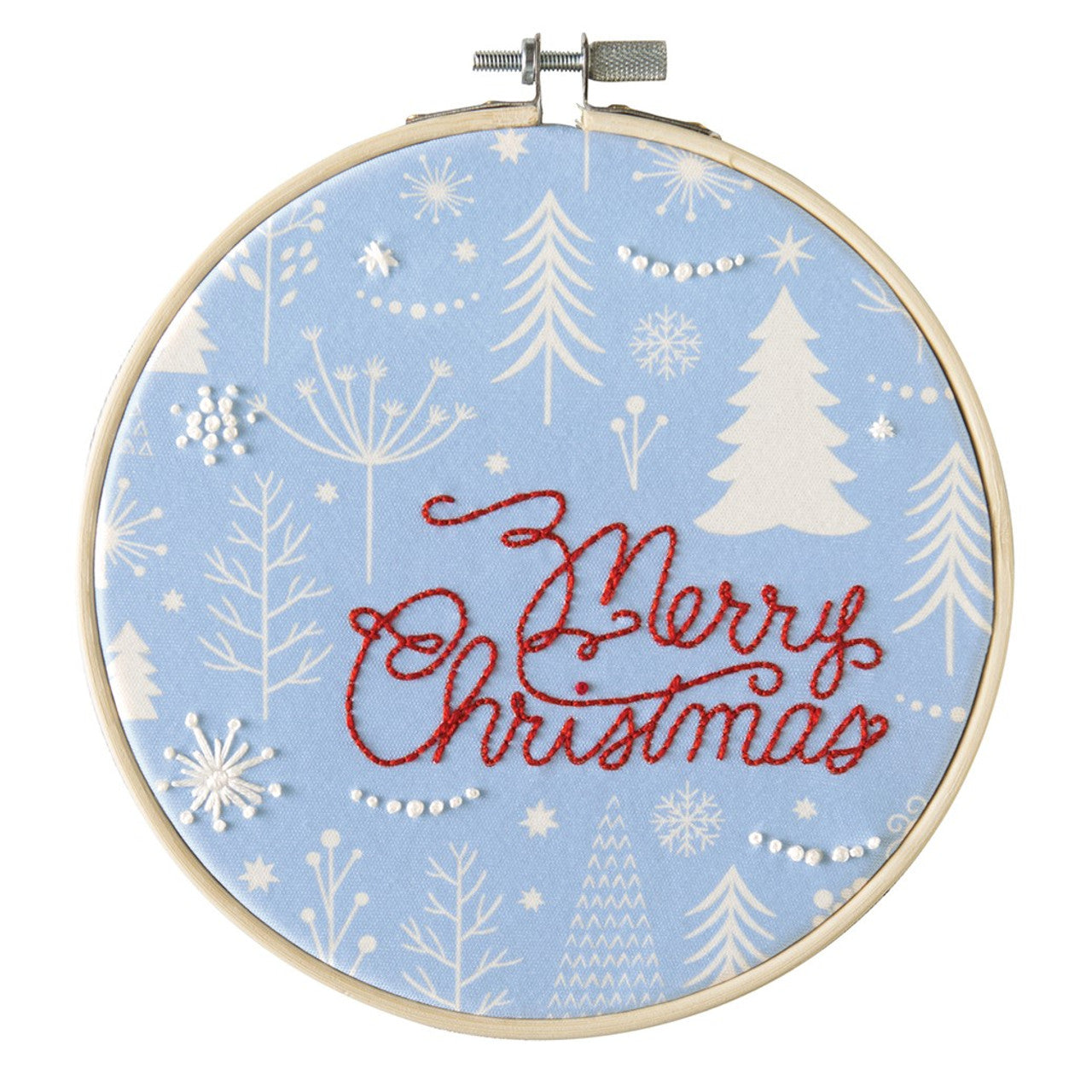 Printed embroidery design features snowflakes, trees and the caption: Merry Christmas.