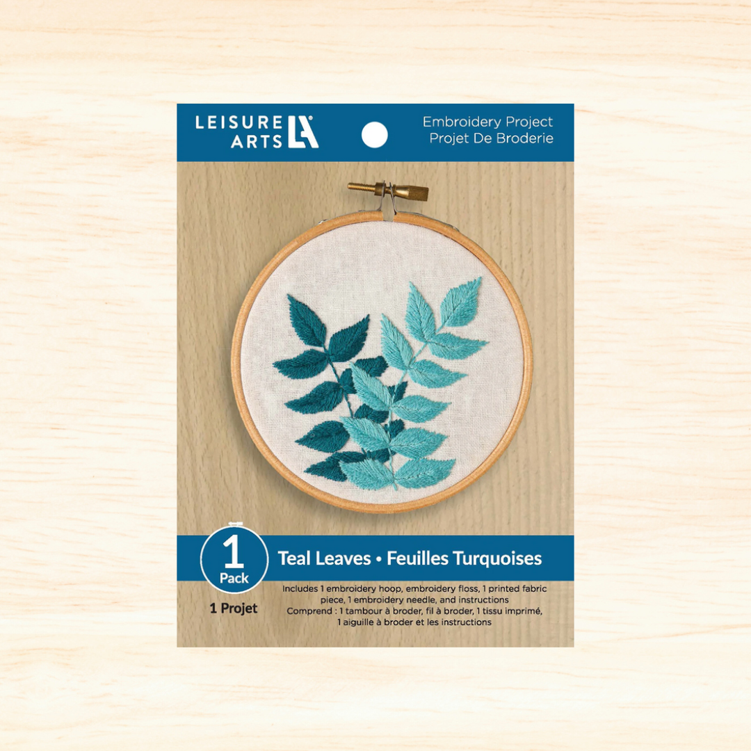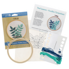 Kit contains: 1 wooden 4" embroidery hoop, 3 floss colours for a total of 7 yards, 1 piece of 7"x 7" printed fabric, 1 needle, and instructions.