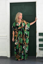 The late 1960s and early 1970s brought the height of popularity of the kaftan in mainstream fashion. Fashion icons such as Diana Vreeland and Elizabeth Taylor touted this dress as the most feminine fashion, and as “fashionable for the beautiful people”. This modern kaftan was inspired by the traditional kaftan of Morocco, where it has been worn for many centuries. Our sewing pattern is for a typical early 1970s kaftan – a V-neck, empire waist, pullover dress. The flattering drape of this full dress makes it comfortable and graceful. Our pattern is floor-length with short sleeves and optional inside ties for shaping. Bodice and panels around the dress allow for mixing of fabric prints.