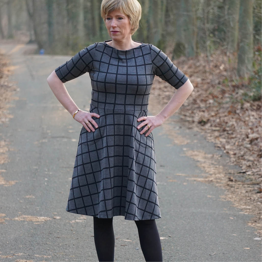Asta jersey dress has a fitted body, slightly flared four-gore skirt with patch pockets.