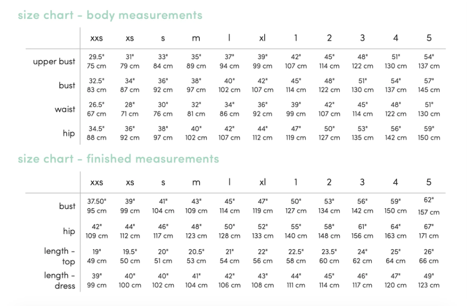 54″ (1.4 m) wide fabric: Top, 1.25 – 2 yd (1.1 – 1.9 m) // Dress, 2.5 – 4 yd (2.3 – 3.6 m).