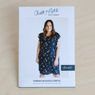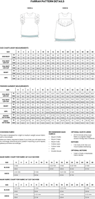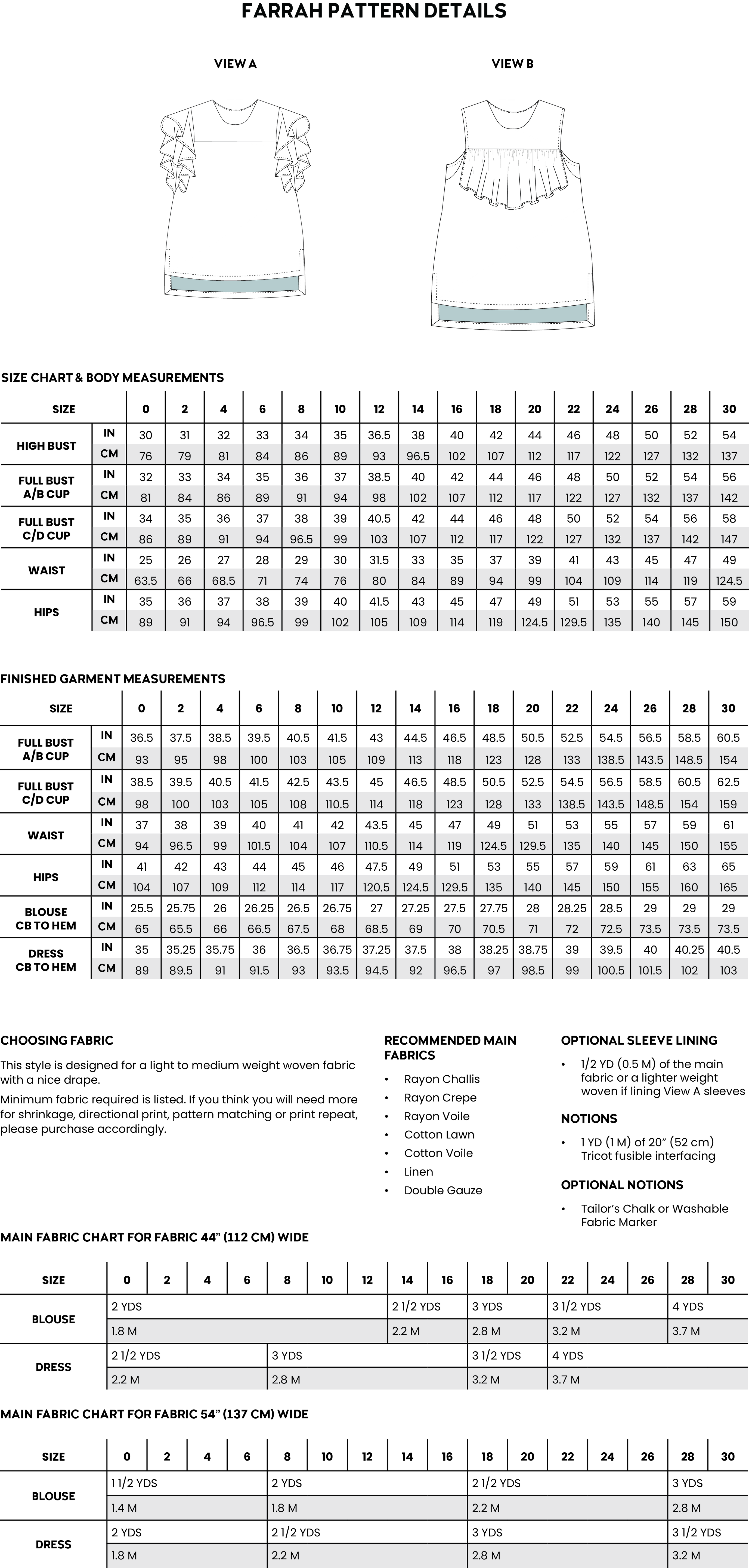 The Farrah pattern is a ruffle detailed tunic blouse and knee-length dress. View A includes ruffle short sleeves and View B is sleeveless with a front ruffle. Both views include a side slit with a high-low hem detail.