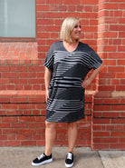 This is the perfect throw on dress with its slight cocoon shape, extended shoulder line, patch pockets and a shaped hemline.