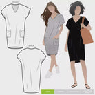 Slip on "V" neck dress with an extended shoulder line and patch pockets