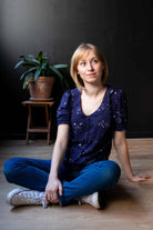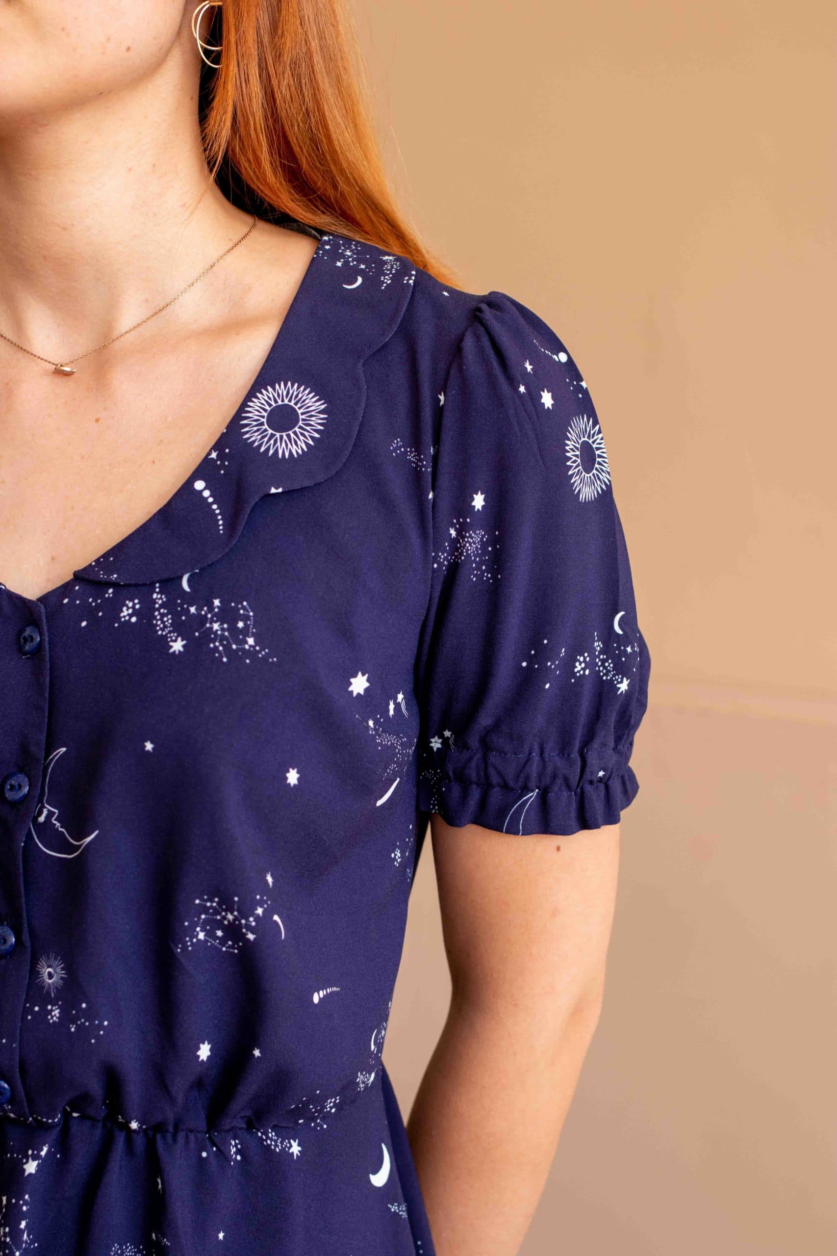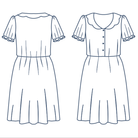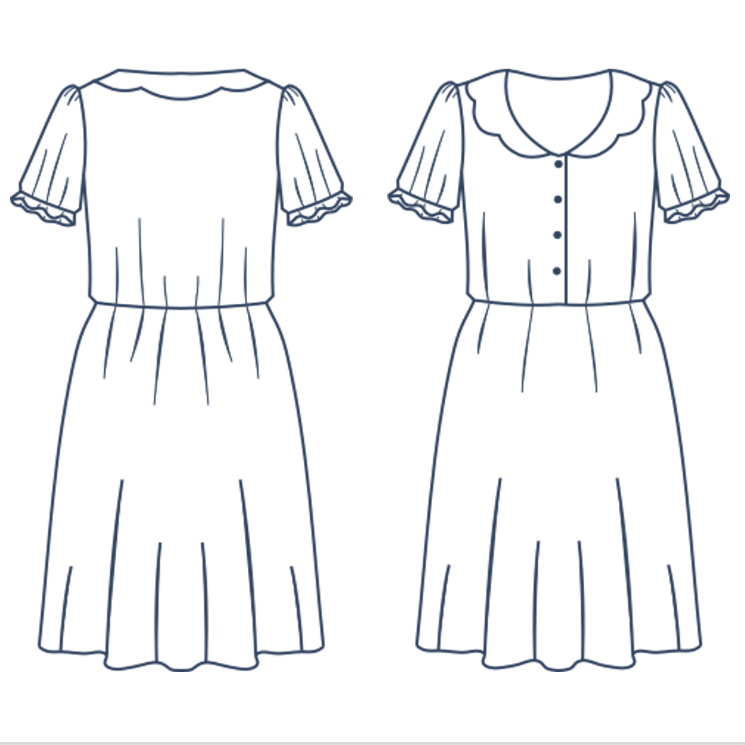 A delicate buttoned-up dress with an elastic waistband and a pretty scalloped collar. The pattern includes 2 sleeves versions and a blouse option. Its wise design enables all choices of fabrics. An intermediate level of difficulty will seduce expert seamstresses but will also convince beginners to dare a project that requires patience and thoroughness.