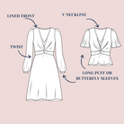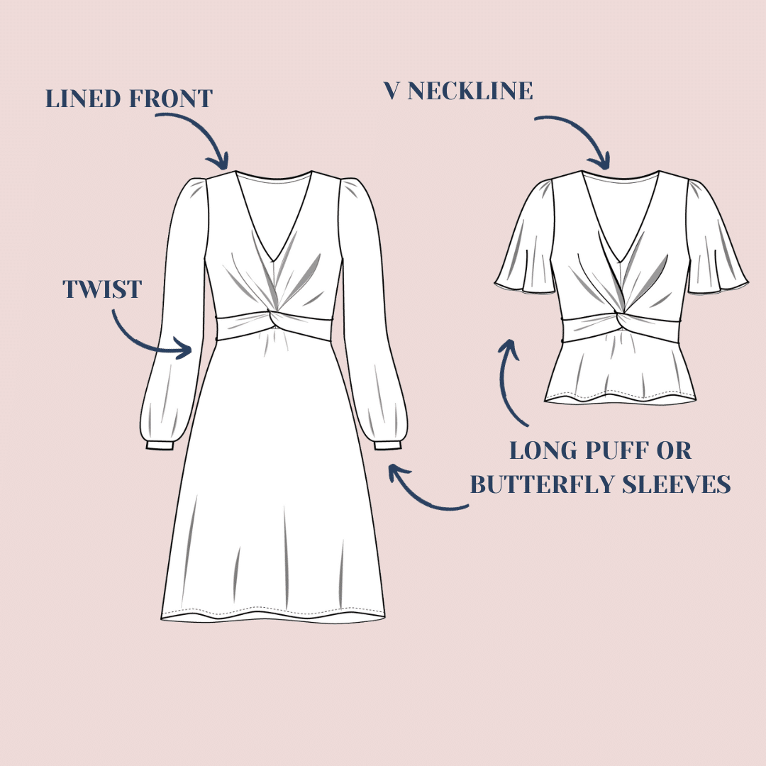 Solstice is an elegant looking dress. Solstice can also be sewn as a blouse and offers two sleeve options: Butterfly sleeves to bring lightness or slightly puffy sleeves finished with a cuff.