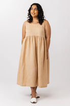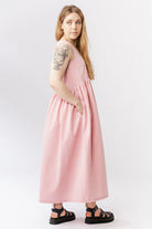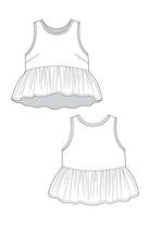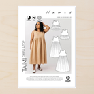 Taimi is a fashionably simple sewing pattern that includes a top and a dress variation. Both variations feature a voluminous, gathered hem, and a round neckline and armholes that are finished with binding. The top is hip-length, and slightly longer in the back. The dress waist seam is curved, its hemline comes down to the ankle, and it has handy in-seam side pockets.