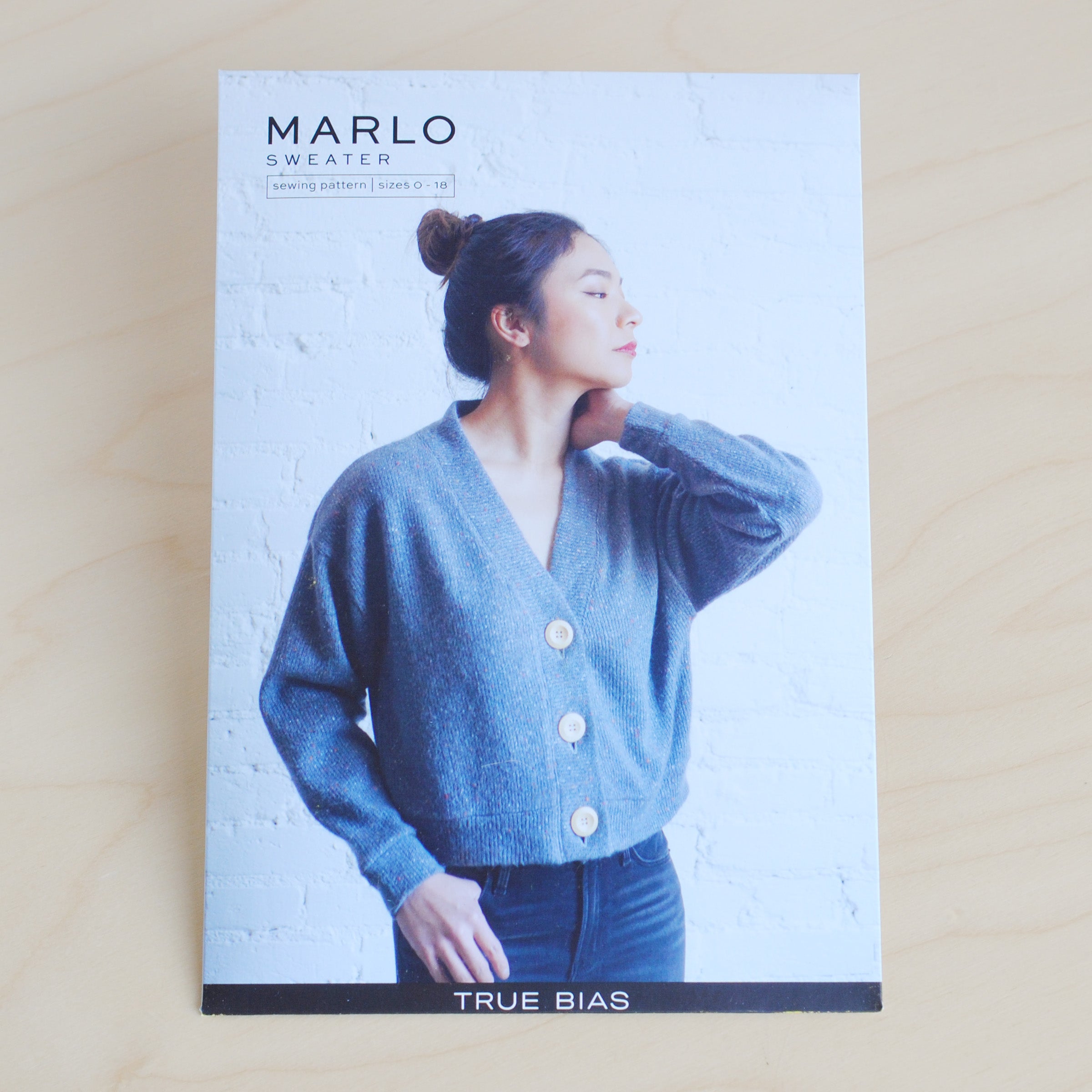The Marlo Pattern is an oversized sweater with a drop shoulder, deep V-neck, wide bands, and large buttons. View A is cropped length. View B has patch pockets and hits above midthigh.