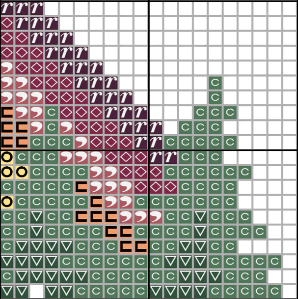 This design is 59 stitches wide by 67 stitches high and involves the use of 13 different colours.