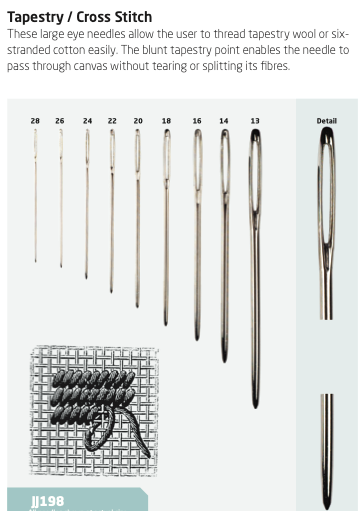 - These large eye needles allow the user to thread tapestry wool or six- stranded cotton easily. The blunt tapestry point enables the needle to pass through canvas without tearing or splitting its fibres.