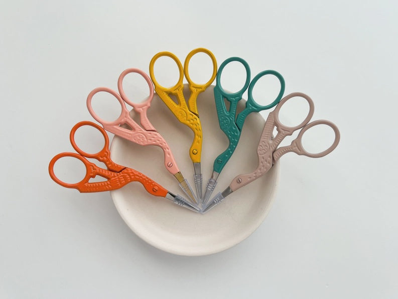 Small, colorful sewing scissors featuring a popular stork design are perfect for various needlework uses such as: embroidery, cross stitch, sewing, quilting, crochet, knitting and more.