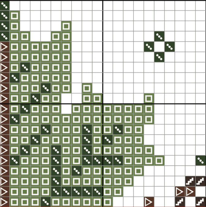 This design is 60 stitches wide by 47 stitches high and involves the use of 7 different colours (4 for the green version, 6 for the orange version).